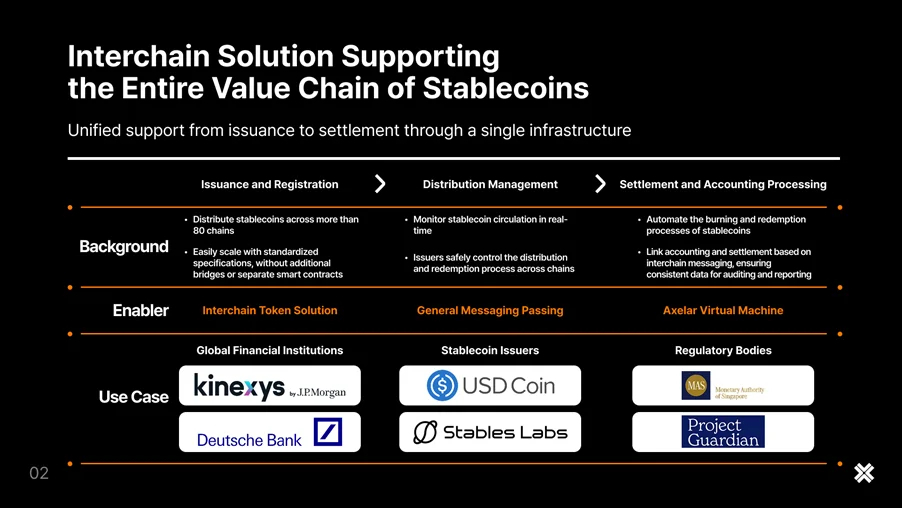 From the perspective of financial institutions, Axelar is a “technology layer that integrates issuers, chains, and applications into a unified interoperability pattern.”