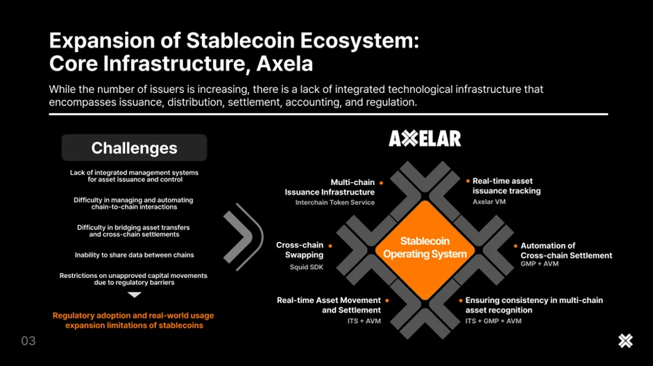 Rather than issuing new stablecoins directly, Axelar aims to provide an infrastructure-level solution to this question. Without issuing stablecoins or performing KYC/AML, and while leaving the issuance responsibility to banks, custodians, and VASPs, Axelar serves as a non-issuing interchain infrastructure layer that facilitates cross-chain circulation, settlement, and state synchronization.