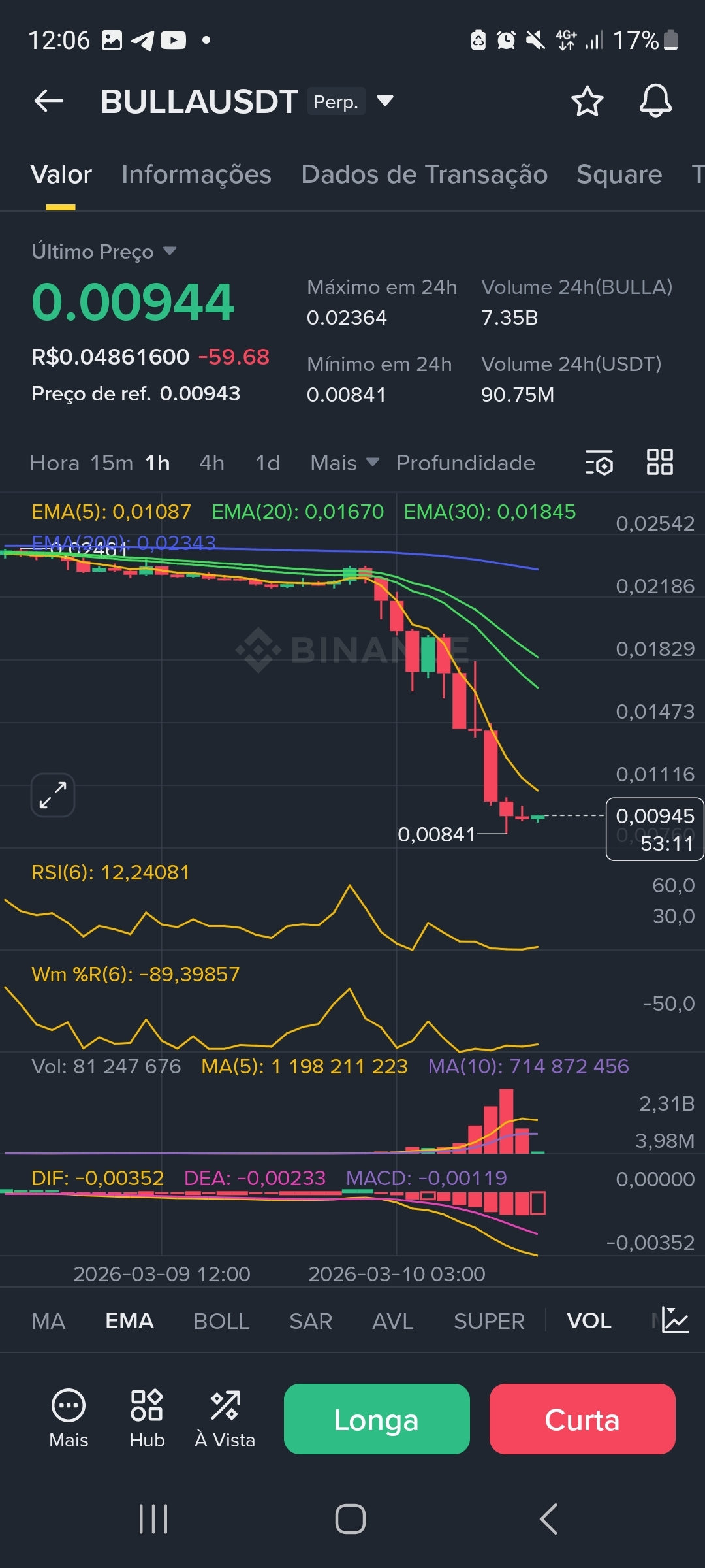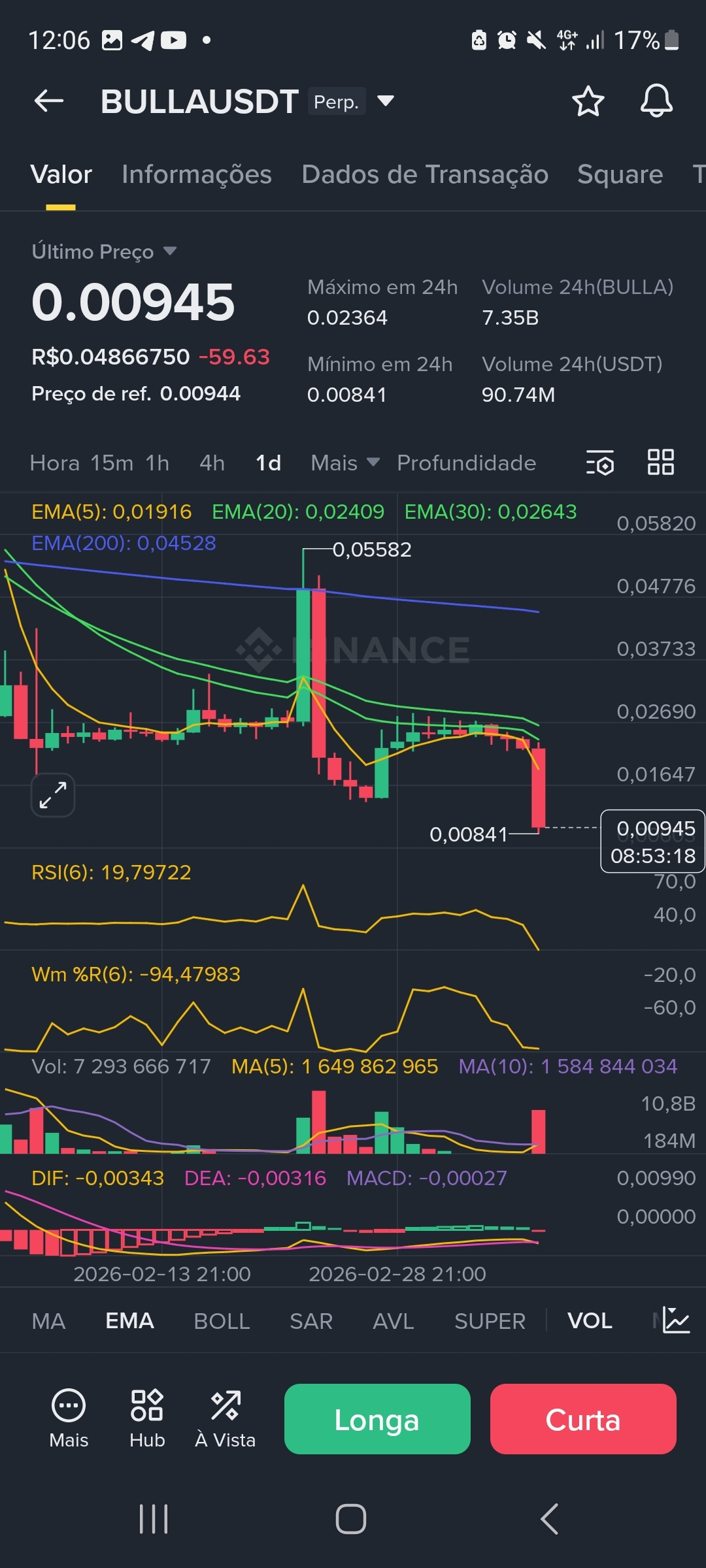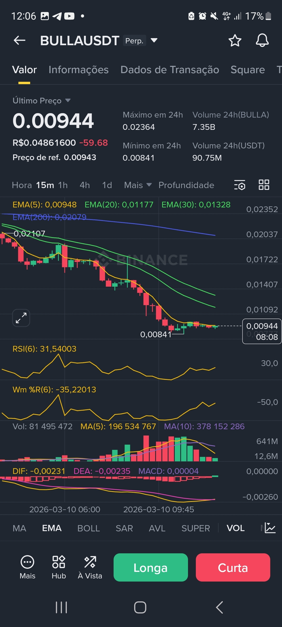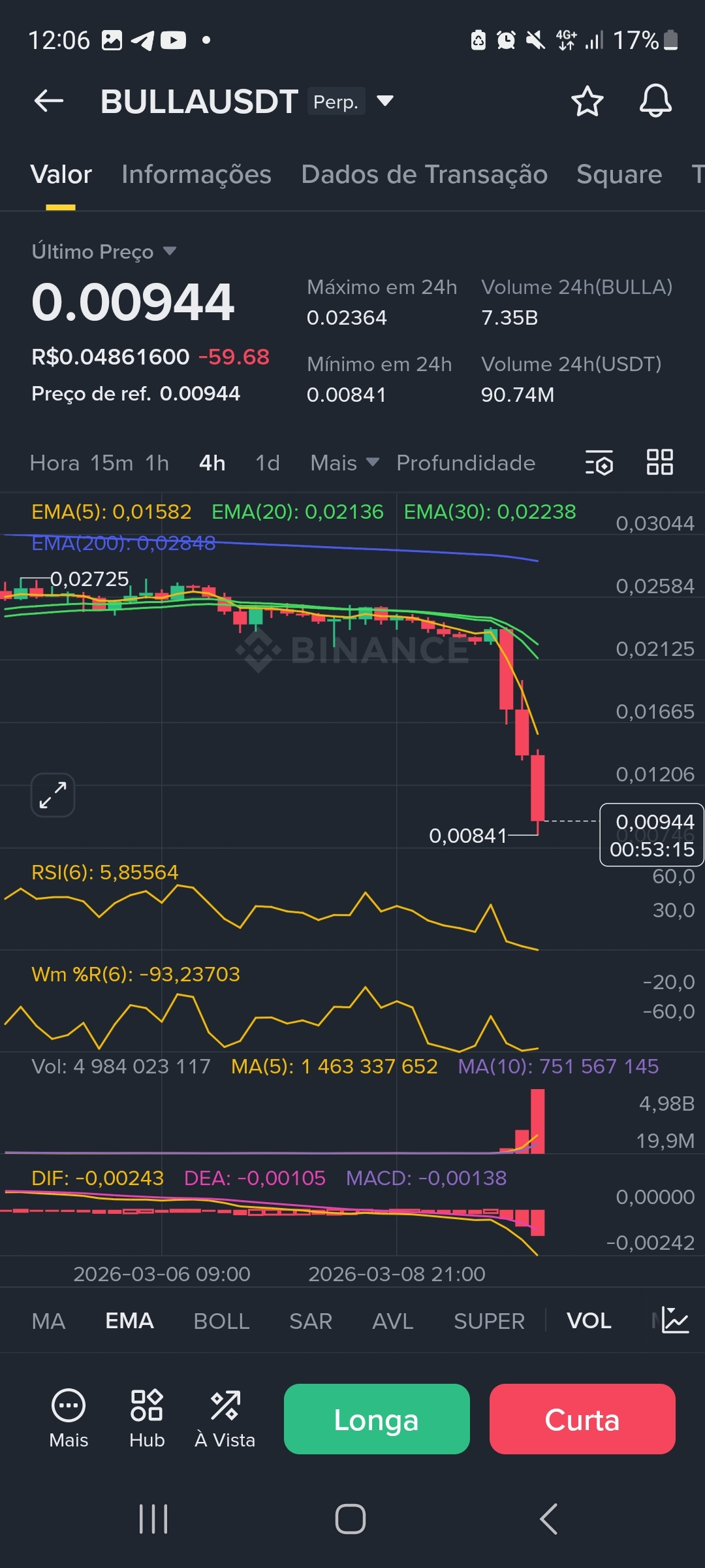 Como o fundo de 24h (0.00841) não pode ser renovado para validarmos a inversão, a entrada deve ser estritamente acionada apenas quando o preço superar a EMA 5 👈🏻no M15 👈🏻 com volume (sinal de "Maldade" ou engolfo altista).