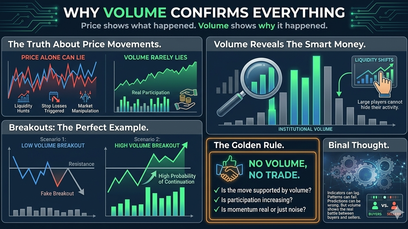 Volume represents real participation in the market buyers and sellers actively committing capital.