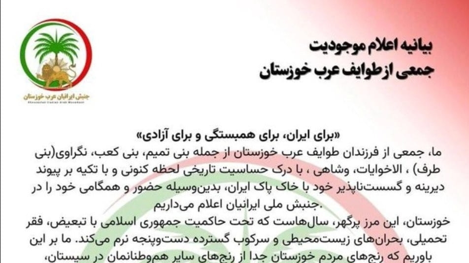 Reports indicate that a group calling itself the Arab Tribes Assembly of Khuzestan released a statement criticizing the Iranian regime and calling for political change.