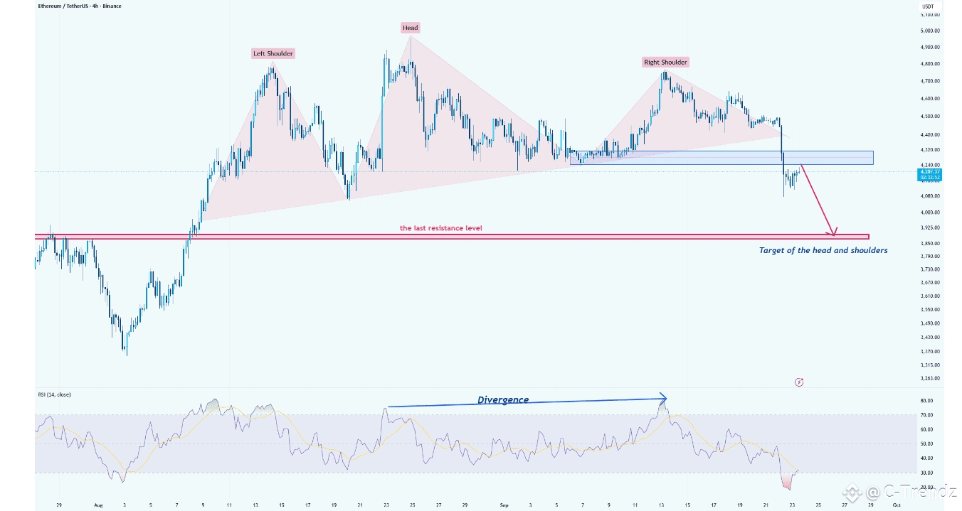 Invalidation: a clean, sustained reclaim and close back above the blue supply zone (above ~4.32–4.40k with conviction) would invalidate the immediate H&S bearish thesis and open the door for a deeper retrace.