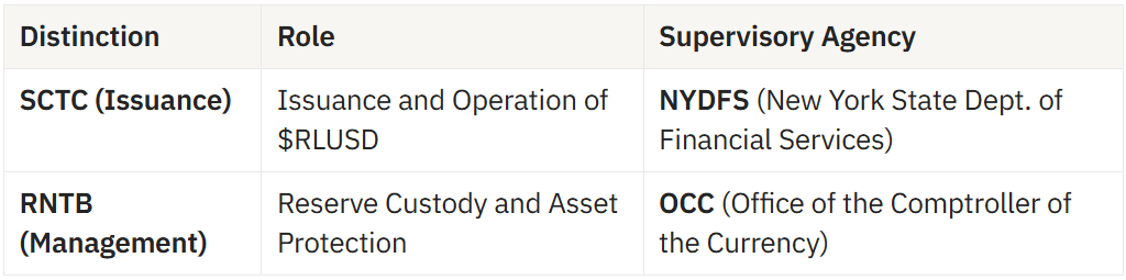 The most critical insight from the establishment of RNTB is the strict separation, under federal regulation, between the entity issuing the coin and the entity managing the funds that preserve the asset's value.