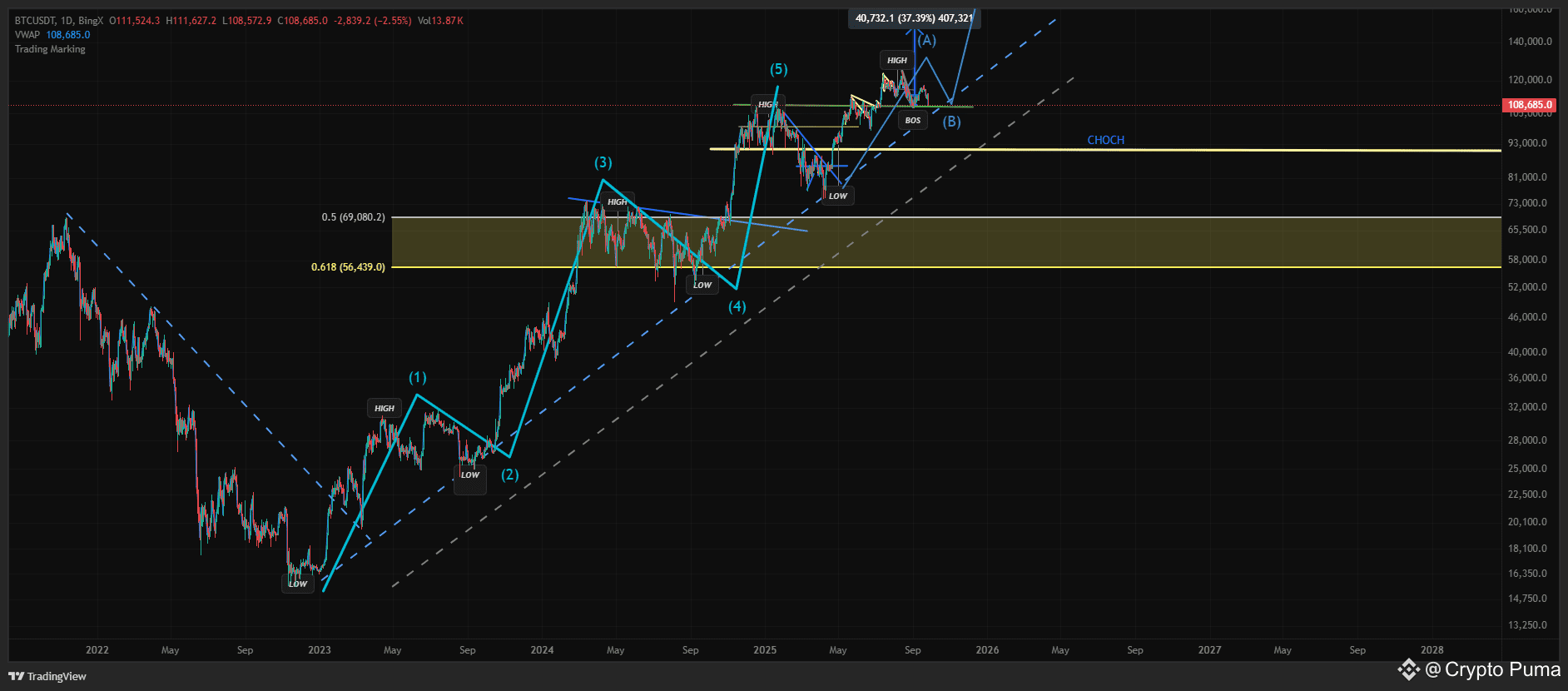 The Extreme Target: A highly euphoric scenario could push prices toward the 200,000−220,000 USD extended target.
