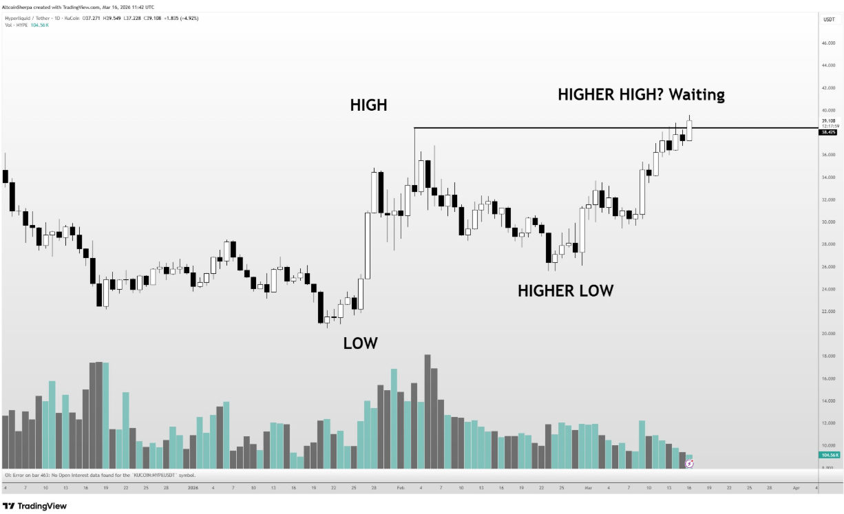 The daily chart tells a straightforward story. After forming a local low, HYPE staged a strong recovery push that created the prior high, then pulled back to set a higher low before climbing again. That sequence, low then high then higher low, is the kind of structure traders look for as evidence that buyers are in control. Right now, price is pressing against that earlier high, and the key question is whether it holds as resistance or flips into support.