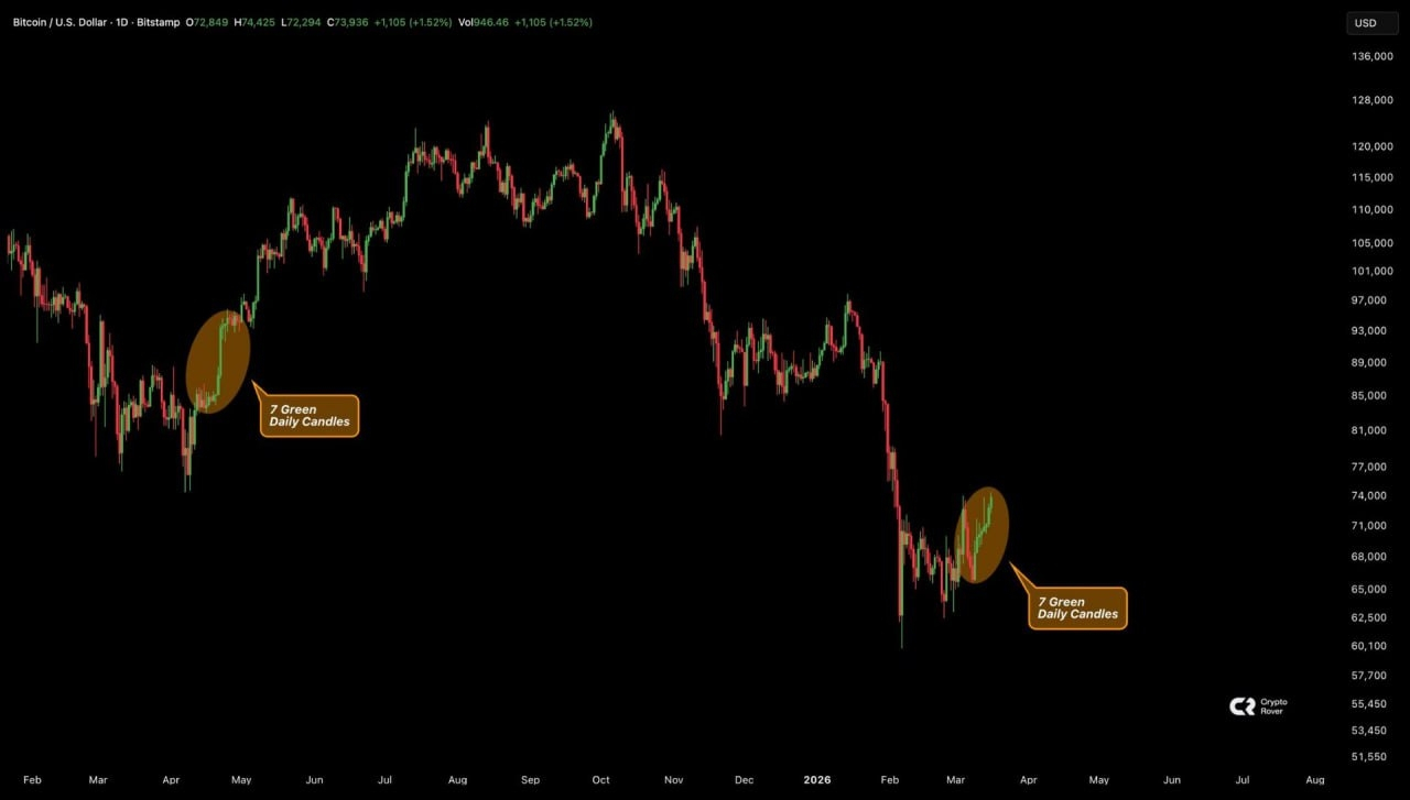 BTC has just closed 7 consecutive green daily candles — the last time this happened was after Trump delayed tariffs in April 2025.