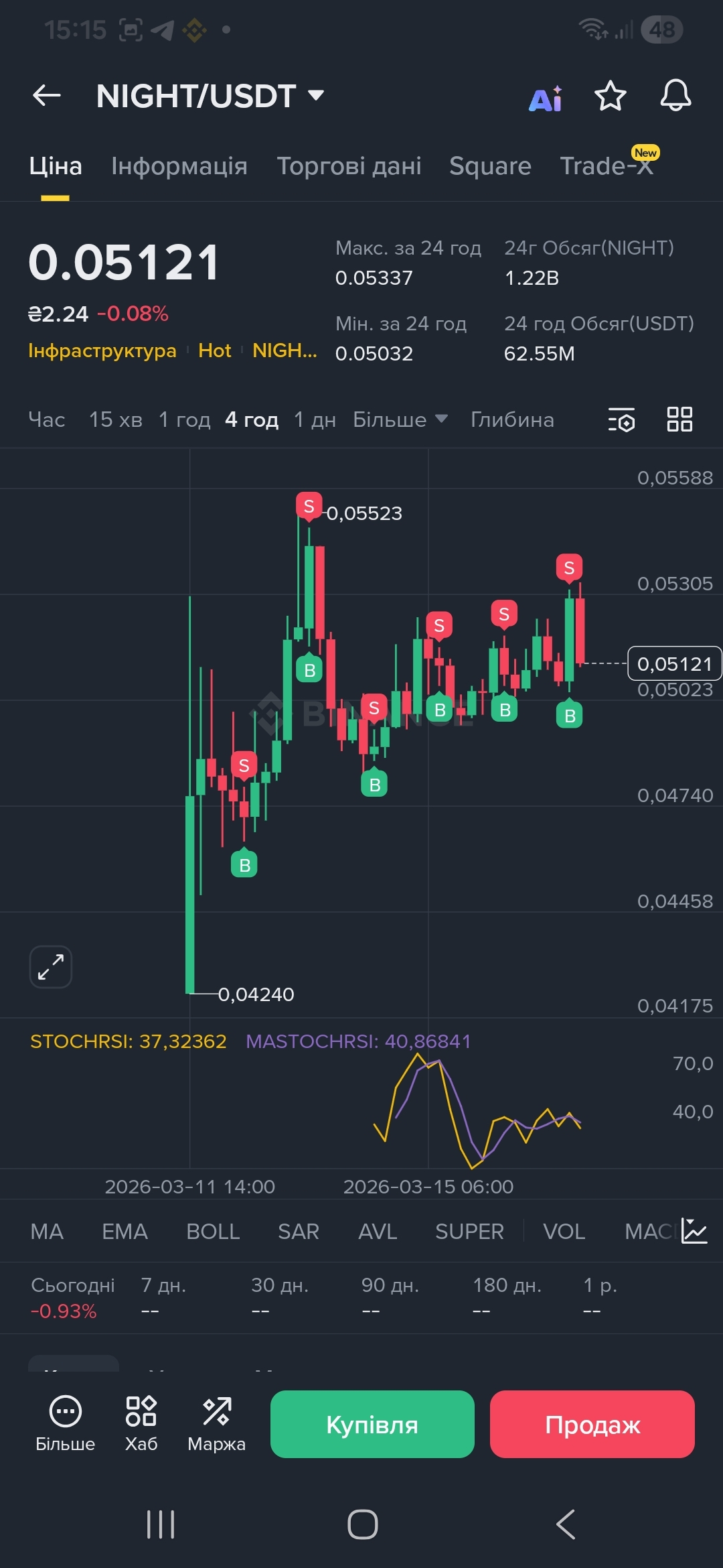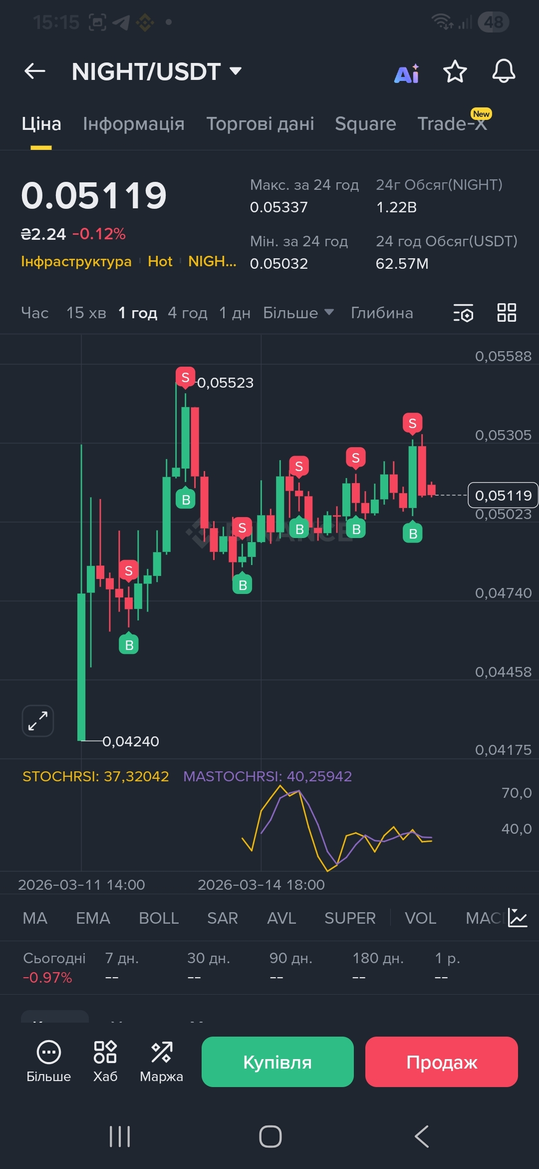 Stoch RSI на графіку знаходиться приблизно в середній зоні (~35-40), що говорить про відсутність сильного перекуплення або перепроданості.