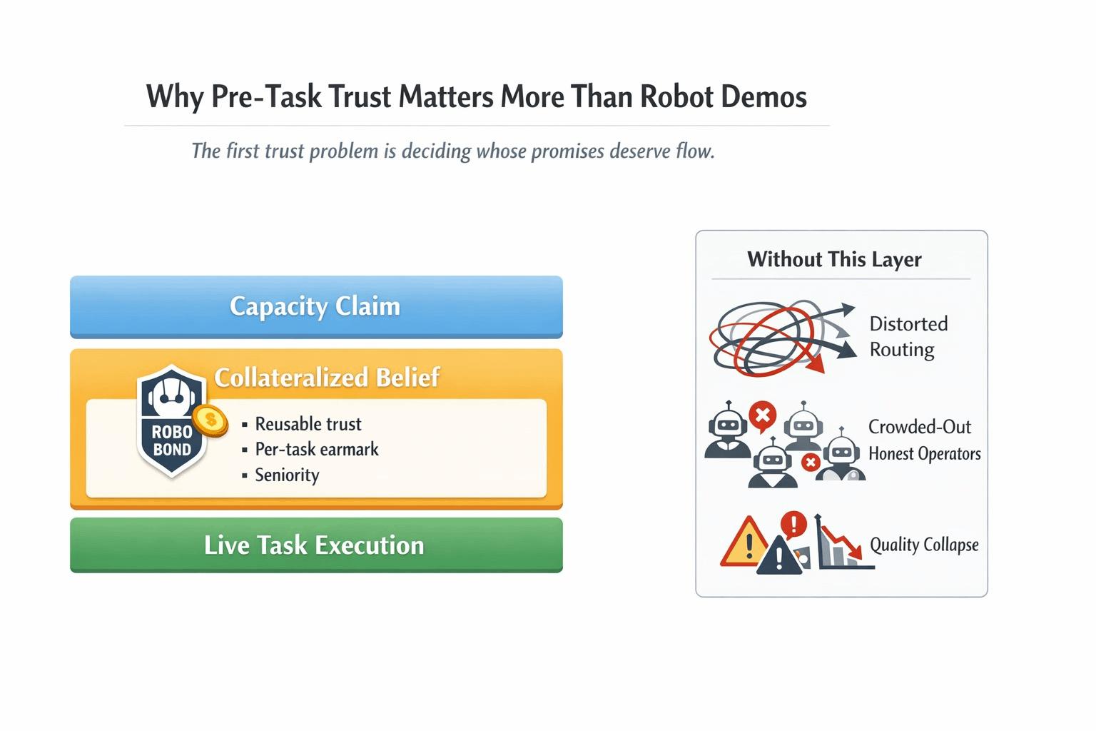 So far my ROBO reading was happening in the mode that many people read robotics tokens, which is as an additional effort to package machine behavior in crypto language. The further I sat on the bond design the more it was likely that Fabric was obsessed with pre-task credibility. That is a far more significant and narrower problem. In case the network is able to price belief badly, the rest of the market never cleans up enough to make a difference. When the network is able to price belief effectively, then routing, settlement and delegation begin resting on something more difficult than marketing.