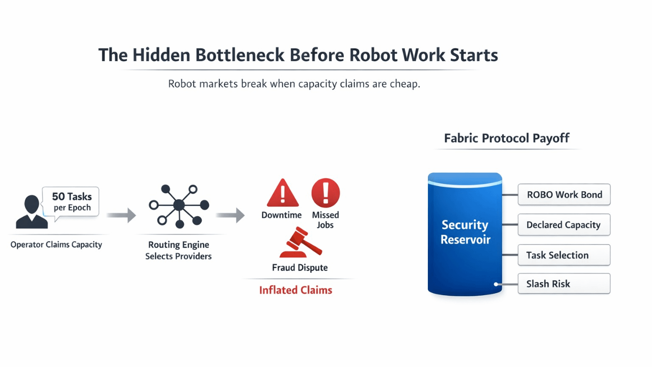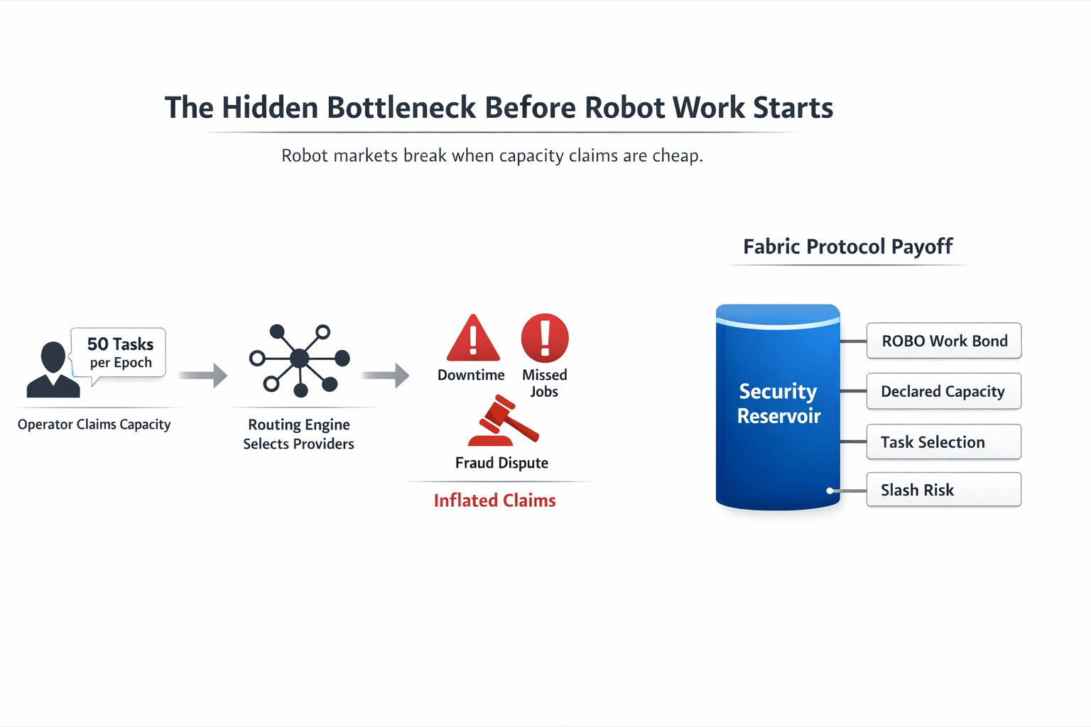 A fleet operator appears and tells them that they can accept a given volume of throughput this epoch with their machines. A buyer would like to have deliveries, inspections, data collection or any other machine task completed in time. The network must choose who is to be selected. When such claims of capacity are easy to make, the whole market will be distorted by the time any robot can demonstrate anything. It is rational to over promise. Selection gets gamed. Whitish operators are trampled by noisier ones. Later the failures manifest themselves in the form of lost work, wasted time, fraud cases, or quality failures. The whitepaper of Fabric is excessively clear in this regard: the necessary minimum bond is proportional to reported capacity, and the choice of tasks is not only proportioned according to reservoir value but also according to the length of hold of the bond with verification by on-chain Merkle proofs.
