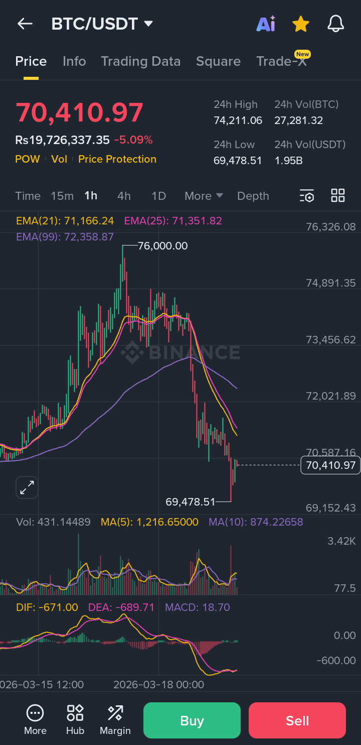 Looking at your chart, BTC is currently hugging the lower wick of its recent range. The EMA(99) at $72,358 is now acting as strong resistance, while the $69,478 low is the "must-hold" support.