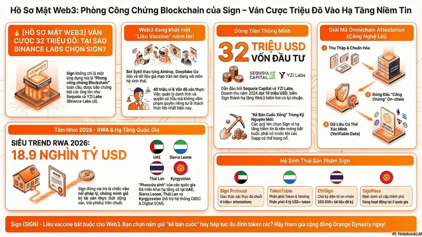 Hãy nhìn vào cách họ ứng dụng thực tế qua hệ sinh thái Orange Dynasty. Một ngày đẹp trời, anh em tham gia launchpad, đi xin việc trong thị trường crypto, hay nhận airdrop. Thay vì phải điền form lằng nhằng, nơm nớp lo sợ sàn giao dịch bán thông tin cá nhân, anh em chỉ cần sử dụng hệ thống Danh tính phi tập trung (DID) của Sign. Vượt qua KYC/AML một lần duy nhất, mọi thứ được mã hóa an toàn. Sign đang cấp cho anh em một "tấm hộ chiếu kỹ thuật số" quyền lực nhất để tự do đi lại trên không gian mạng mà không sợ bất cứ rào cản nào.