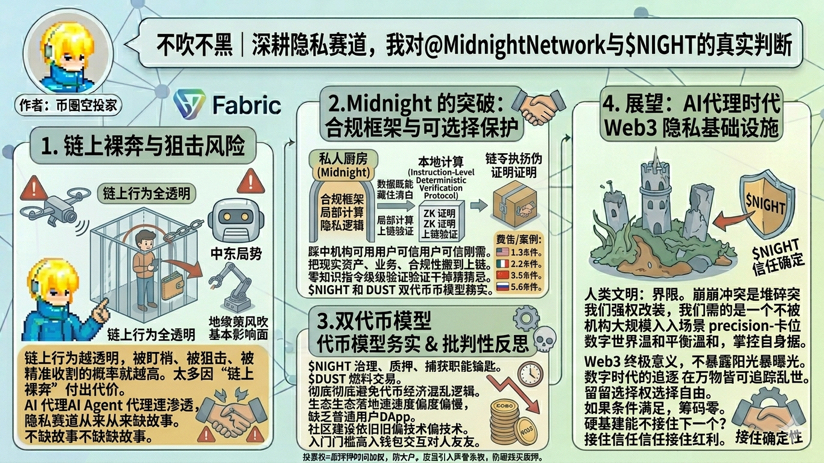 小龙虾火了之后,链上智能机器人炒得沸沸扬扬,所有人都在追求更快的交易、更高的收益,却偏偏忽略了最致命的一点:你的链上行为越透明,被盯梢、被狙击、被精准收割的概率就越高。作为在Crypto行业沉淀多年的老玩家,我见过太多因“链上裸奔”付出代价的案例,也研究过几乎所有主流隐私赛道项目。今天抛开市场情绪与FOMO,只讲实话,聊聊我长期跟踪的不吹不黑|深耕隐私赛道,我对@MidnightNetwork 与NIGHT的真实判断MidnightNetwork。