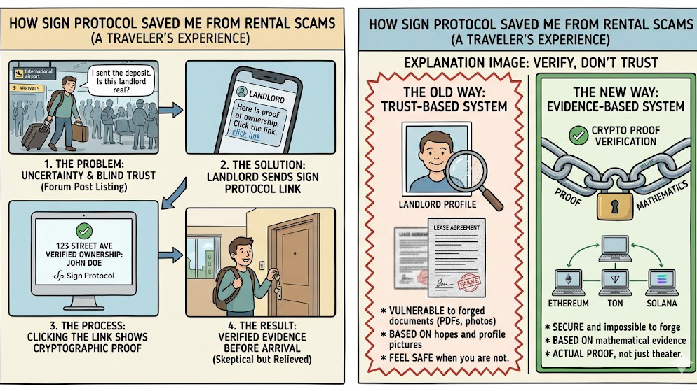I stood frozen in the middle of the busy airport arrivals hall feeling completely lost and fearful. The heavy canvas suitcase dug deeply into my numb shoulder and strange words echoed right above me. I had just wired a massive cash deposit to a complete stranger I discovered on the unknown website. The crushing realization that I might have just funded my clever scammer was starting to settle in. I kept staring at the bright screen of my phone looking at an address made up of long street names. I desperately hoped there was a totally real apartment waiting for me at the end of the long route. I was deeply afraid it would just turn out to be an empty dirt lot or an abandoned brick warehouse. It is genuinely terrifying how much blind faith we are forced to place in strangers when we travel. "The truth is most of these platforms are just layers of theater designed to make us feel safe when we are actually not." I had rented enough vacation homes to know how easily people could lie to me. Anyone could forge a fake property deed or steal beautiful pictures from a legitimate listing page. They can confidently falsely claim the private home as their own without leaving their warm bedroom. Anyone with a new keyboard can make a digital document look highly official if they try hard today. I was truly terrified that I had fallen hard for a very convincingly crafted fake rental agreement. But a few days before I even boarded my incredibly long flight the landlord sent me something wild. It was a straightforward page link to a secure and robust verification system called Sign Protocol. He told me he understood exactly how incredibly sketchy renting a room from an online forum was too. He explicitly wanted to truly prove the apartment was completely real and actually belonged to him. I am certainly not a good computer expert or a technology enthusiast by any stretch of human logic. But I nervously clicked the bright link anyway while expecting to quickly see some outdated website. I thought it would just be another entirely useless and deeply blurry scanned copy of his passport. Instead it brilliantly showed me a clear and undeniable mathematical proof of legitimate ownership.