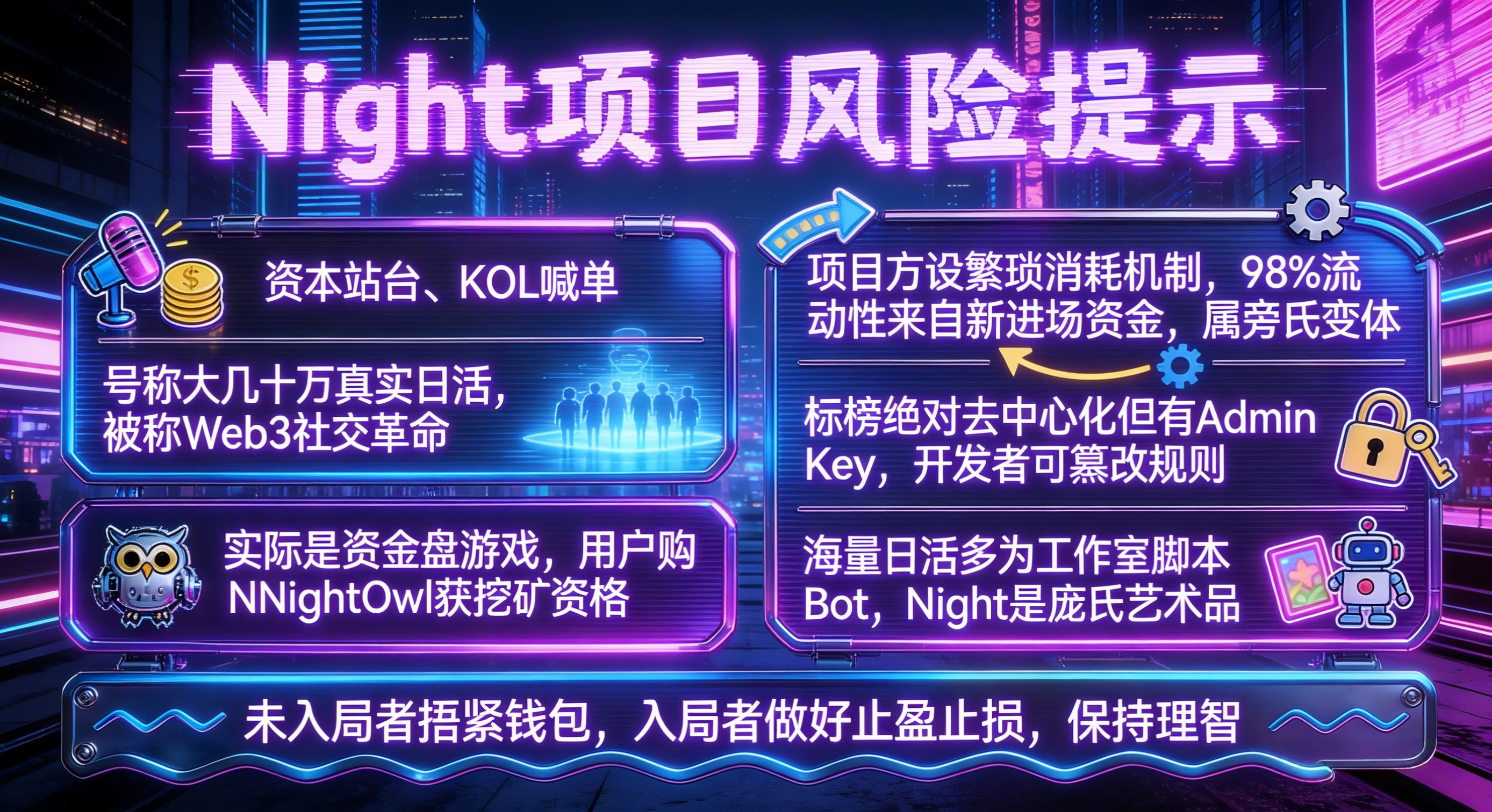 先抛开那些“重塑夜间价值”“社交挖矿”的洗脑话术,#night 本质到底是什么?扒到底就是粗暴的资金盘套路:买NIGHTOwl门票进场挖矿、强制复投、等着找下家接盘。花钱买张虚拟图片,换个在虚拟场景里“熬夜挖矿”的资格,凌晨的每一次点击操作,都被换算成所谓治理代币。项目方怕大户砸盘提现,就搞出一堆复杂消耗机制,美其名曰“经济飞轮”。补疲劳、升装备,钱在池子里来回转,账面数字看着翻倍,多巴胺疯狂飙升,却没人敢问核心问题:这些高额利润,到底从哪来?