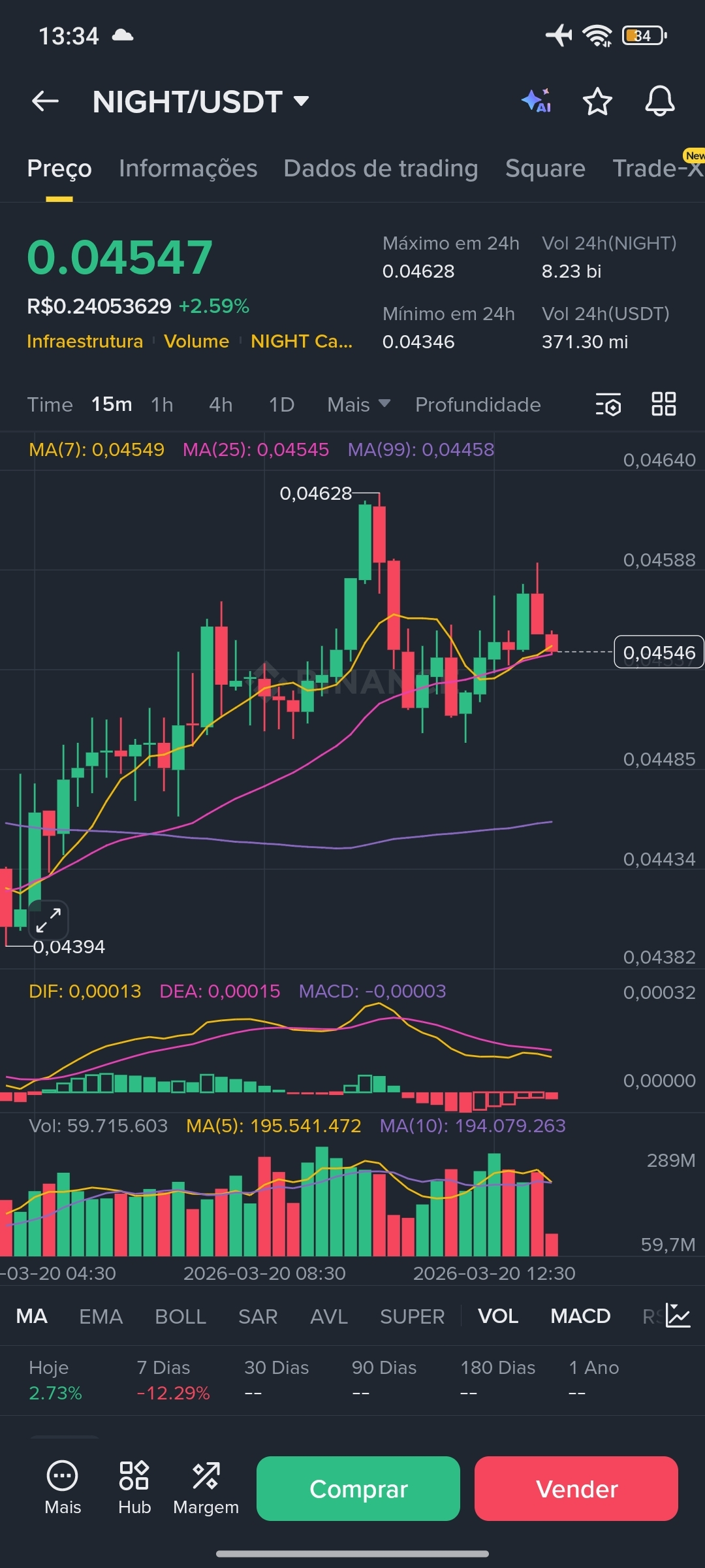 Hoje de tarde o gráfico me prendeu. Depois de testar $0,04394 nas primeiras horas, o $NIGHT não cedeu. Segurou acima da MA(99) em $0,04458 e foi comprimindo devagar em direção às médias curtas — MA(7) e MA(25) praticamente coladas em $0,04549 e $0,04545. Quando três médias ficam tão próximas assim, o mercado está em modo de decisão. Ou rompe, ou volta. Fiquei só olhando por um tempo, sem pressa de fazer nada.