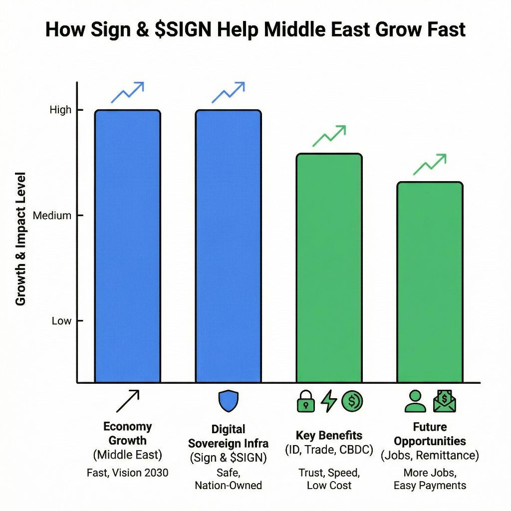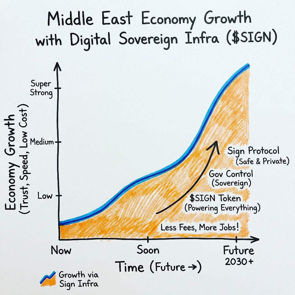 Omni-chain mean it connect different blockchains. So governments can use it easy. Also TokenTable for send tokens to many people fair way. No cheating.Now think about economy growth. Middle East want attract investors from world. But trust is big problem. With Sign, they can make digital ID that work everywhere. Tourists, business people verify fast. No paper work headache. Also for trade. Oil, gold, real estate – all can tokenise on Sign. Make it easy buy sell cross border. Less cost, more speed.Many projects talk about identity but Sign different. It build for governments first. They have partnerships in region like Abu Dhabi Blockchain Center. That show they serious for Middle East. Founder talk on TV about how digital sovereign help when world unstable. Capital run away sometimes, but with Sign, nations keep control of money, identity, assets on chain. Like digital lifeboat.I read their whitepaper on sign.global. It say S.I.G.N. is for national systems – money, ID, capital. Sign Protocol is the base layer for proofs. Very strong tech with zero-knowledge to keep private but still verify. No one see your data but know it true.For young people like me in India, I see big chance. Middle East close to us. Many Indians work there. With Sign, remittance become super easy and cheap. Send SIGN or stablecoins with proof. No bank take big fees. Also jobs in Web3 grow there. If Sign infra big, more devs, more startups.$SIGN price go up a lot sometimes because real use. Not just hype. Already process billions in tokens. That mean real adoption. When Middle East use it for their growth, $SIGN become more important. Everyone need it for fees, governance.I think @SignOfficial