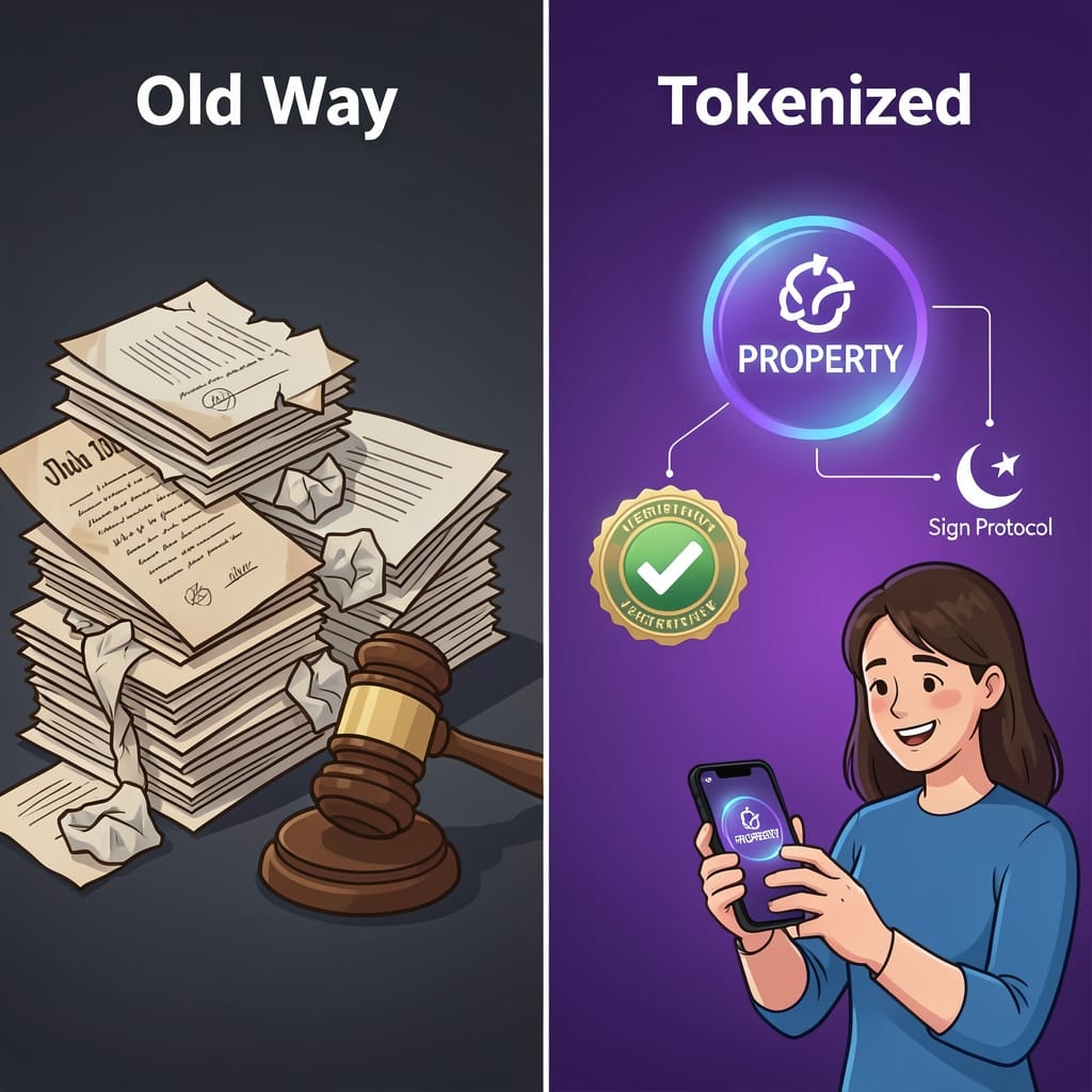 When a property gets tokenized, an independent authority verifies everything. They check government records, confirm the seller's ownership, ensure no disputes exist. Then they create an attestation on Sign.