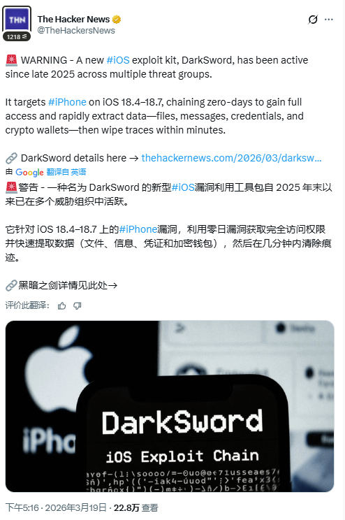 第二则,谷歌威胁情报小组(GTIG)披露了DarkSword,一套针对iPhone的完整漏洞利用链,利用6个漏洞(其中4个为零日),从2025年11月起在沙特、土耳其、乌克兰等地的手机上悄无声息地运行。