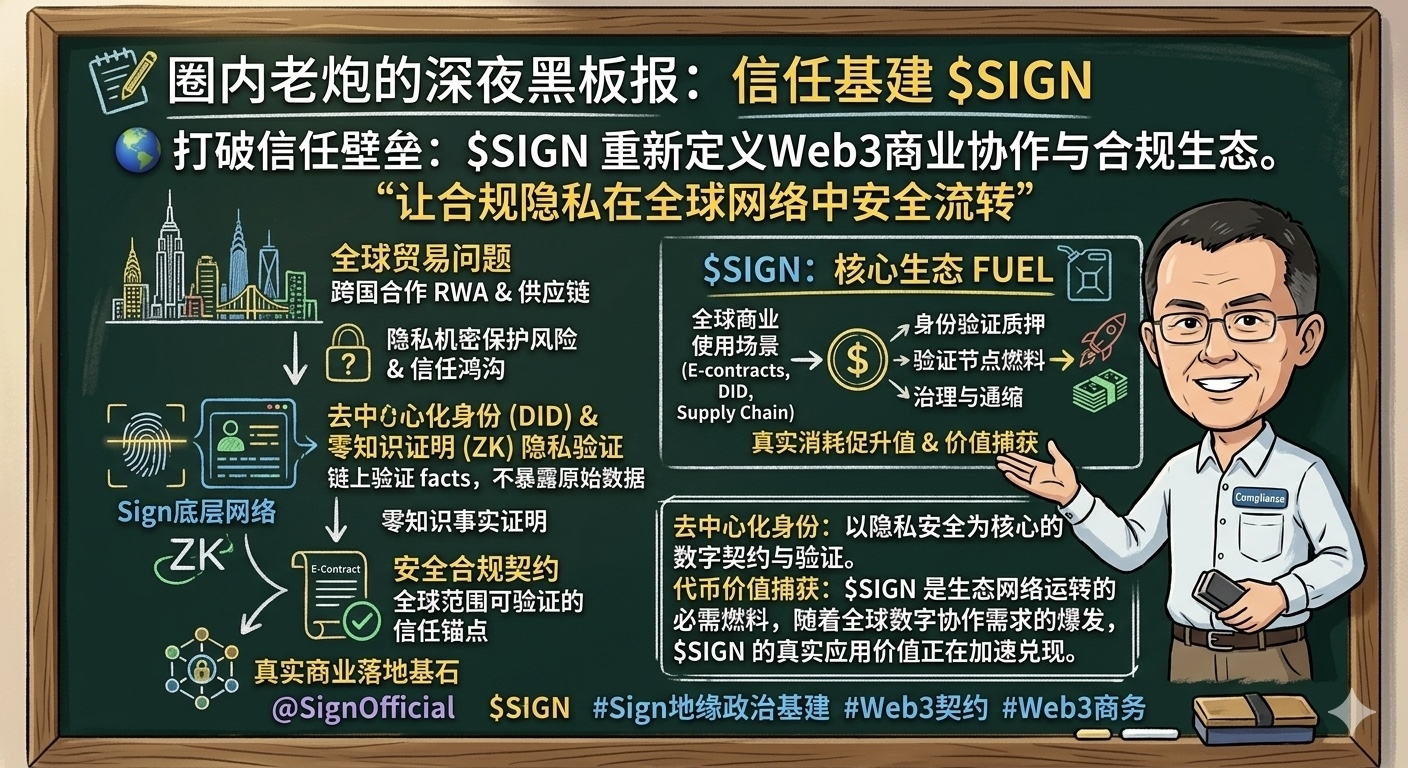 更让我看重的一点,是它极具韧性的经济模型。在 Sign 的生态网络里,$SIGN 可不是什么毫无用处的空气治理币。机构和开发者在这个网络里跑应用、搞合规交互、验证跨国电子契约,都得实打实地烧 $SIGN 当燃料。节点提供中立的验证服务,也会锁定代币。这不是纯靠情绪拉盘,而是有真实世界源源不断的“跨国商业消耗”在下面兜底。业务网络越庞大,代币的生态护城河就越深。