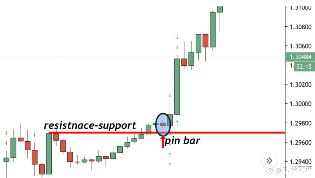 在这种情况下,我们观察到一个阻力位变成支撑位,并且对该位的pin bar形成回弹。