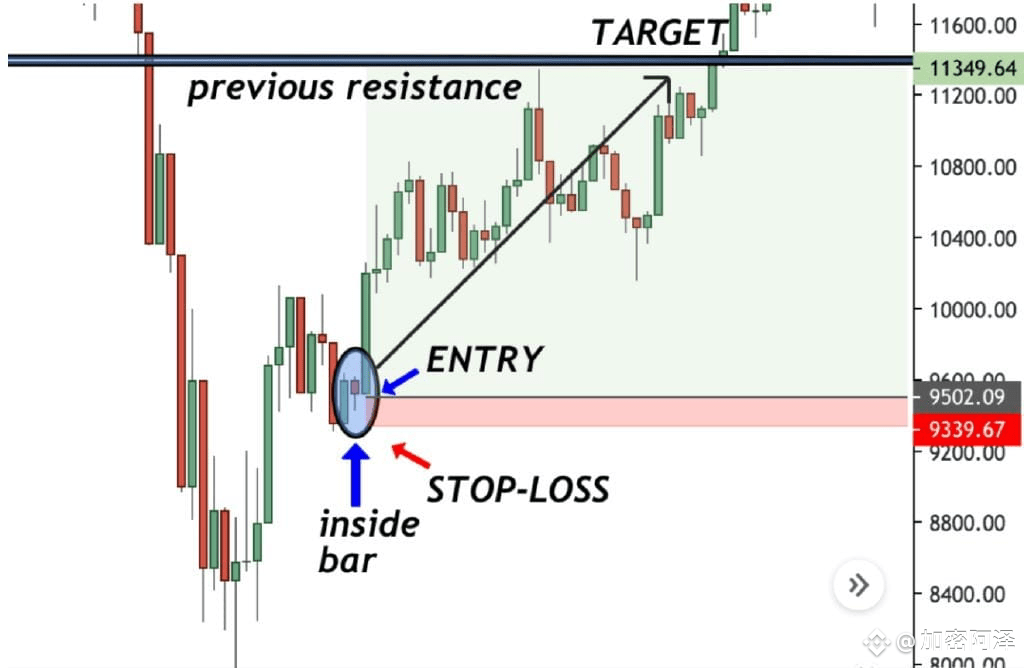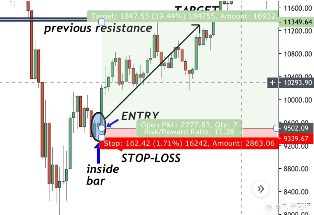 你可以从上图看到,inside bar仅允许你使用很小的止损来“瞄准”更大的回报。上图中的风报比几乎是1:12。