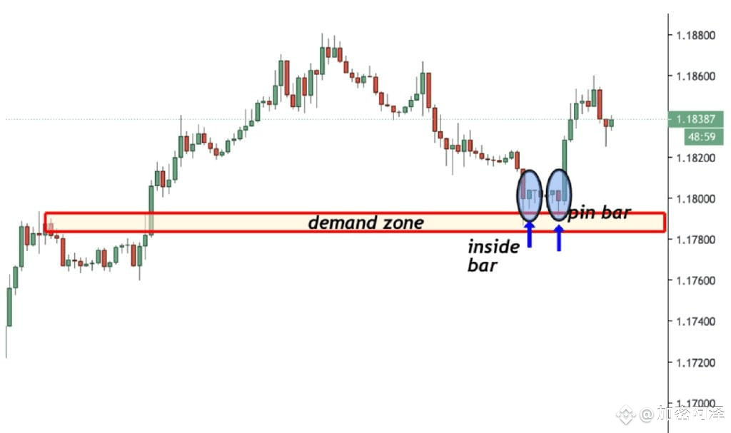 上图有一个主要的需求区域/支撑位,当价格对其进行测试时,会形成一个内包线(inside bar)并吸引大量市场参与者进场。
