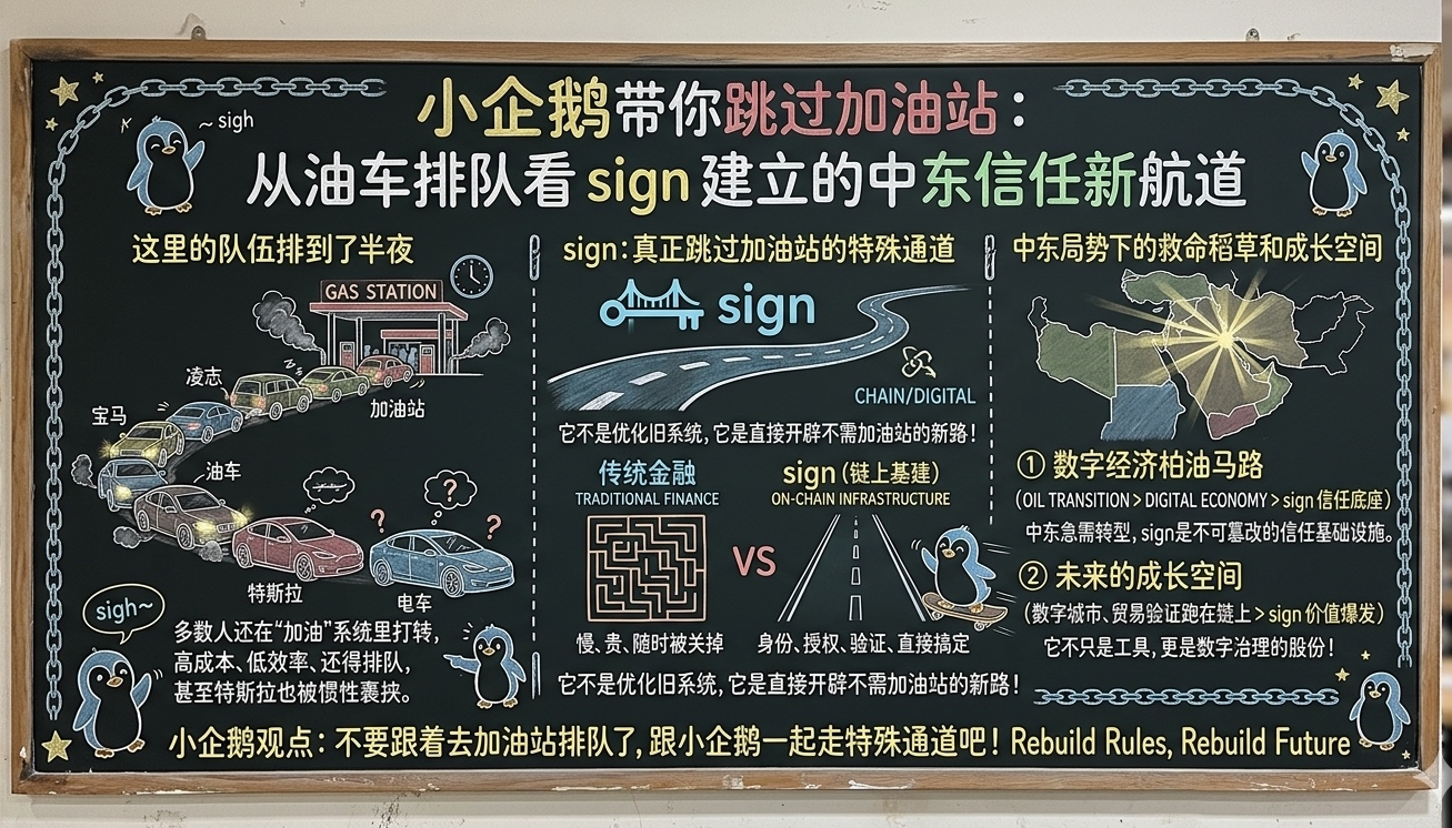 在中东那种局势下,sign 的价值简直就是救命稻草。地缘政治一闹腾,传统系统说停就停,但在中东这种急着从石油转型到数字经济的地方,sign 这种不可篡改的信任底座,简直就是数字世界的柏油马路。而且 sign 以后不只是个工具,小企鹅看它的发展空间,它更像是数字治理的股份。随着中东那边的数字城市、贸易验证都跑在上面,它的价值会跟着信任需求的爆发一起往上窜。