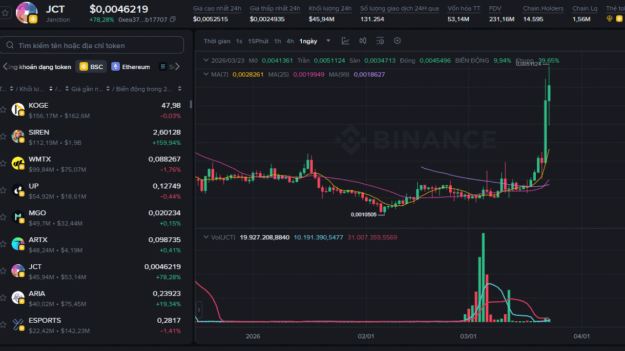 Thị trường vừa chứng kiến một pha "dựng cột" cực kỳ ấn tượng từ JCT (Janction) trên hệ sinh thái BSC. Nhìn vào biểu đồ khung ngày (1D), chúng ta có thể thấy rõ sự thay đổi vị thế từ tích lũy sang bùng nổ: