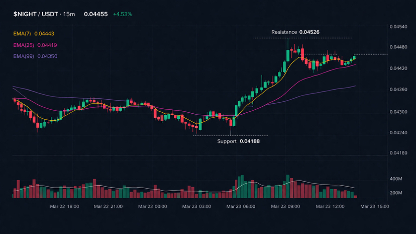 Вчера $NIGHT уходил к 0.04188. Красные свечи, паника. Но уже сегодня цена отскочила к 0.04455. +4.53% за сутки.