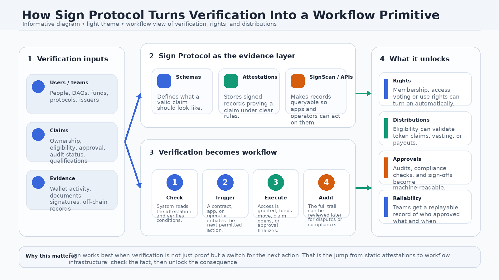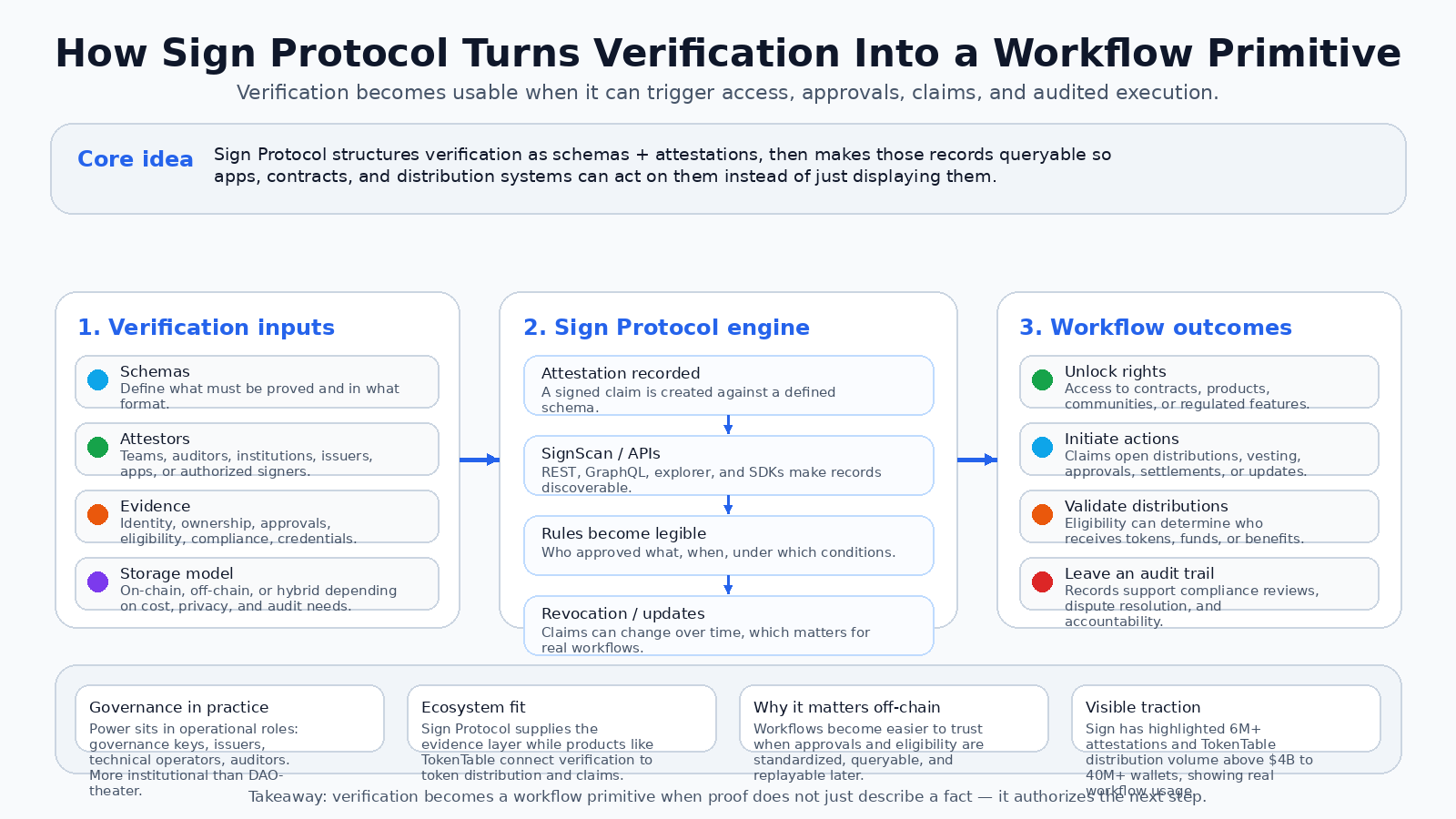 My current view is pretty simple. Sign Protocol is most compelling when verification is tied to consequences. Not identity for identity’s sake. Not credentials as collectibles. Verification that initiates a payment, unlocks a right, validates an allocation, or leaves behind evidence an auditor can actually use. That’s the workflow primitive idea, and Sign has a better shot at it than most because it links schemas and attestations to distribution, querying, and operational governance in one stack.