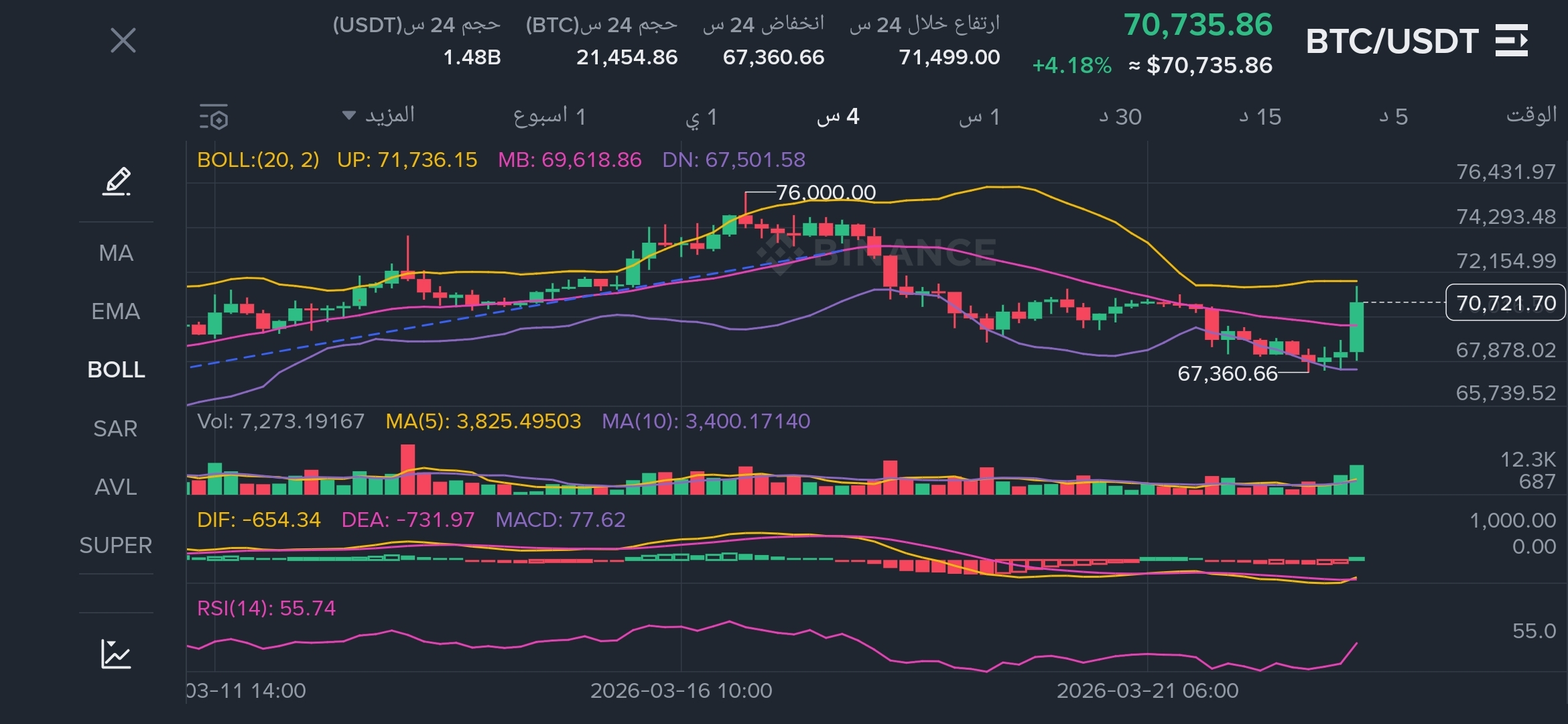 عودة الروح: نجح البيتكوين في استعادة مستويات الـ 70,700$ بعد اختبار قاع محلي عند 67,360$.