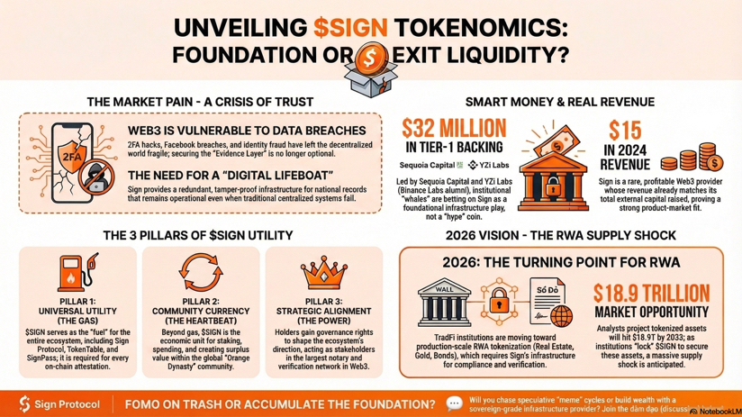 Cá mập không bao giờ đi làm từ thiện, và họ càng không vứt hàng chục triệu đô vào một dự án có token vô dụng. Dòng tiền thông minh luôn đi tìm những tài sản có tính ứng dụng thực tế (Utility). Bọn họ đang cược mạng vào một mảng hạ tầng cốt lõi, nơi token $SIGN không phải là công cụ để xả lên đầu nhỏ lẻ, mà là huyết mạch bắt buộc phải có để vận hành toàn bộ một đế chế xác thực on-chain.