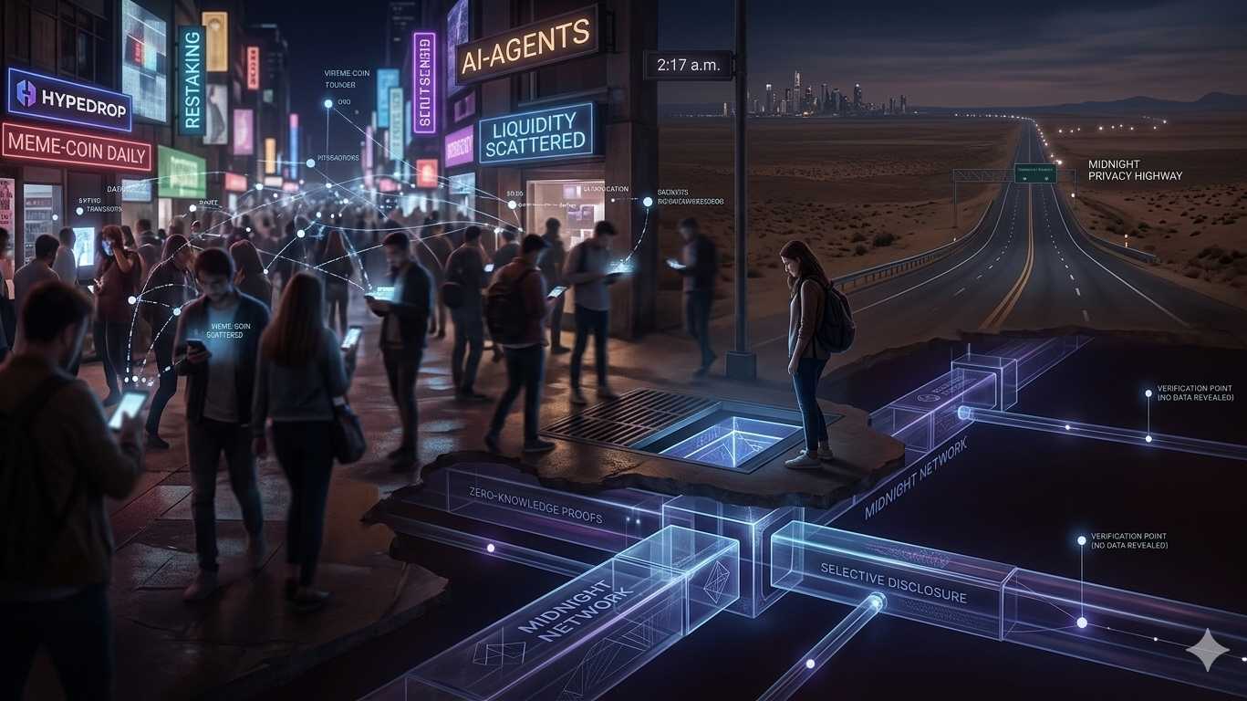 I was scrolling again at 2:17 a.m., half-reading threads, half-questioning why I’m still here, when I stumbled back into the same conversation we’ve been having for years now—privacy, scalability, “the future of crypto,” all dressed up in slightly different fonts. It’s funny how the words change but the vibe doesn’t. Every cycle has its new hero narrative. DeFi fixed finance. NFTs fixed ownership. AI is now apparently fixing intelligence itself. And somewhere in the middle of all that noise, projects like Midnight Network are trying to quietly solve something that’s actually been broken since day one.