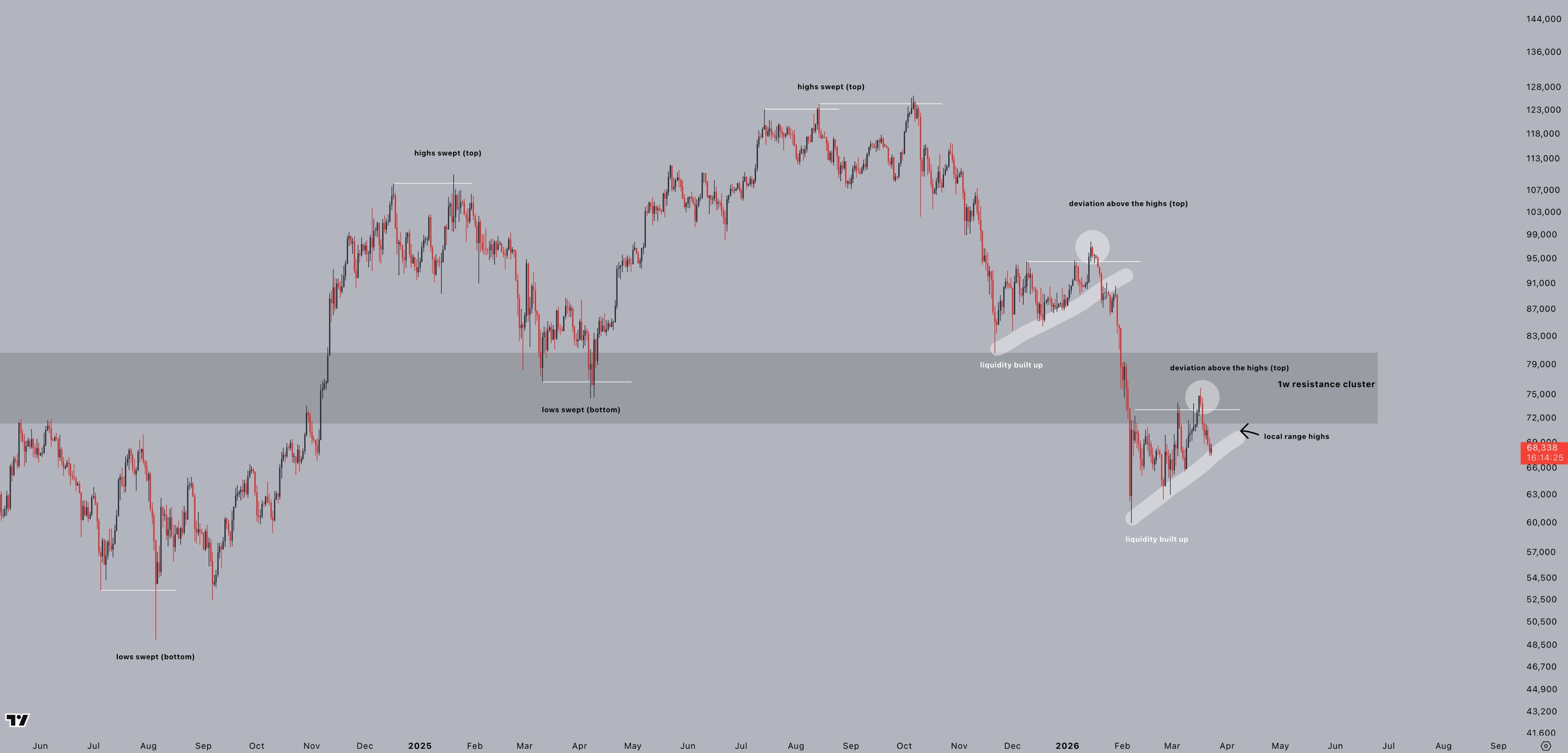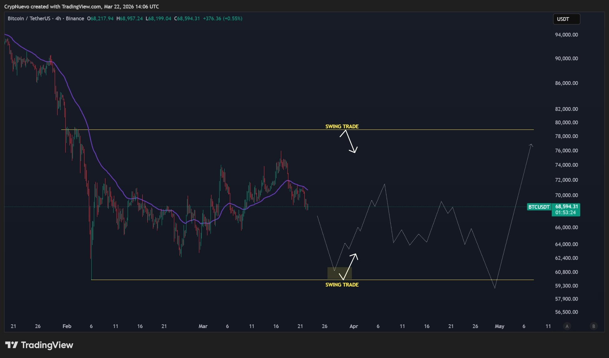 “如果本周初出现短暂冲高,我想在7万美元附近布局,但要保持谨慎,因为若接受度高于7.1万美元,则此策略失效,届时我将看涨至7.3万-7.4万美元。”