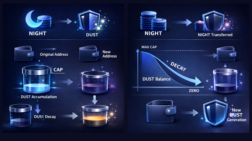 I actually think this is one of the more interesting parts of the architecture. It’s not just about fees. It’s a system designed to control how network resources are used.The cap limits how much resource can accumulate. The non-transferability stops direct resale or secondary-market circulation. The decay after disassociation prevents someone from building up a large reserve, moving the generating NIGHT elsewhere, and still behaving as if the old address retained durable network capacity. Even Midnight’s technical design notes reinforce this by saying that spending during decay is allowed but does not change the decay rate, and that partial spending of NIGHT creates a fresh NIGHT UTXO that starts new DUST generation while the old DUST UTXO decays. That is a pretty deliberate anti-gaming structure. A simple scenario shows both the strength and the headache. Imagine a user holds NIGHT in one address and has been building DUST for regular app activity. Then they send that NIGHT to another address, maybe for treasury reorganization, custody changes, or just ordinary account management. Under Midnight’s design, the old DUST balance does not simply remain as a neutral leftover balance. It begins decaying. The recipient side does not magically inherit a ready-to-use private fuel tank either; a new designation is needed for fresh DUST generation. From an anti-abuse standpoint, that is coherent. From a user-experience standpoint, that is one more thing wallets and apps will need to explain very clearly, or people will think something broke.