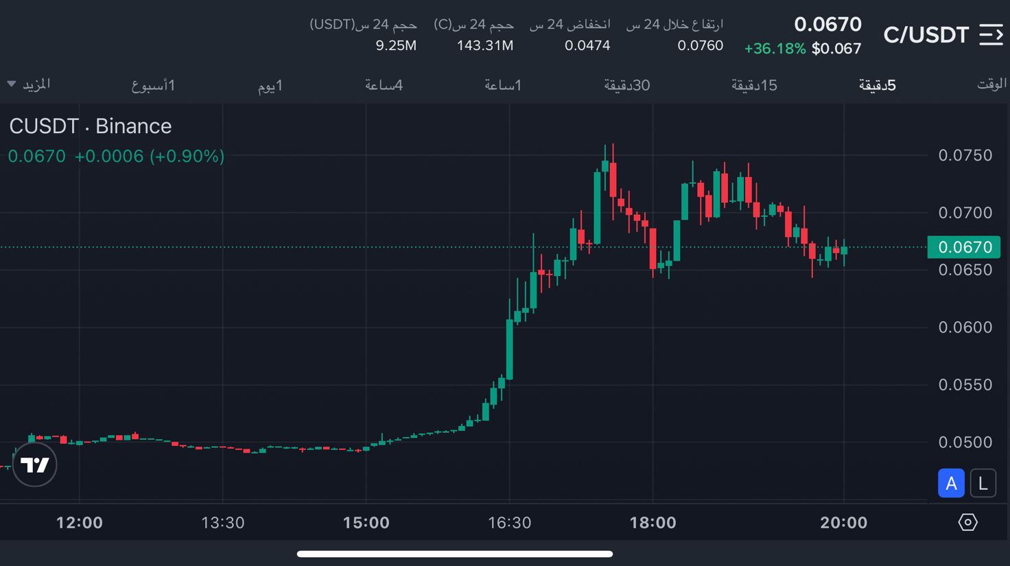 تظهر العملة حالة من الانفجار السعري (Price Spike) القوي، حيث انتقلت من مستويات 0.0500 إلى قمة عند 0.0760. حالياً، السعر يمر بمرحلة تجميع عرضي (Consolidation) وتصحيح بسيط بعد القمة، مع وجود دعم جيد عند منطقة 0.0650. الزخم ما زال إيجابياً طالما بقي السعر فوق المتوسطات السعرية للانطلاقة الأخيرة.