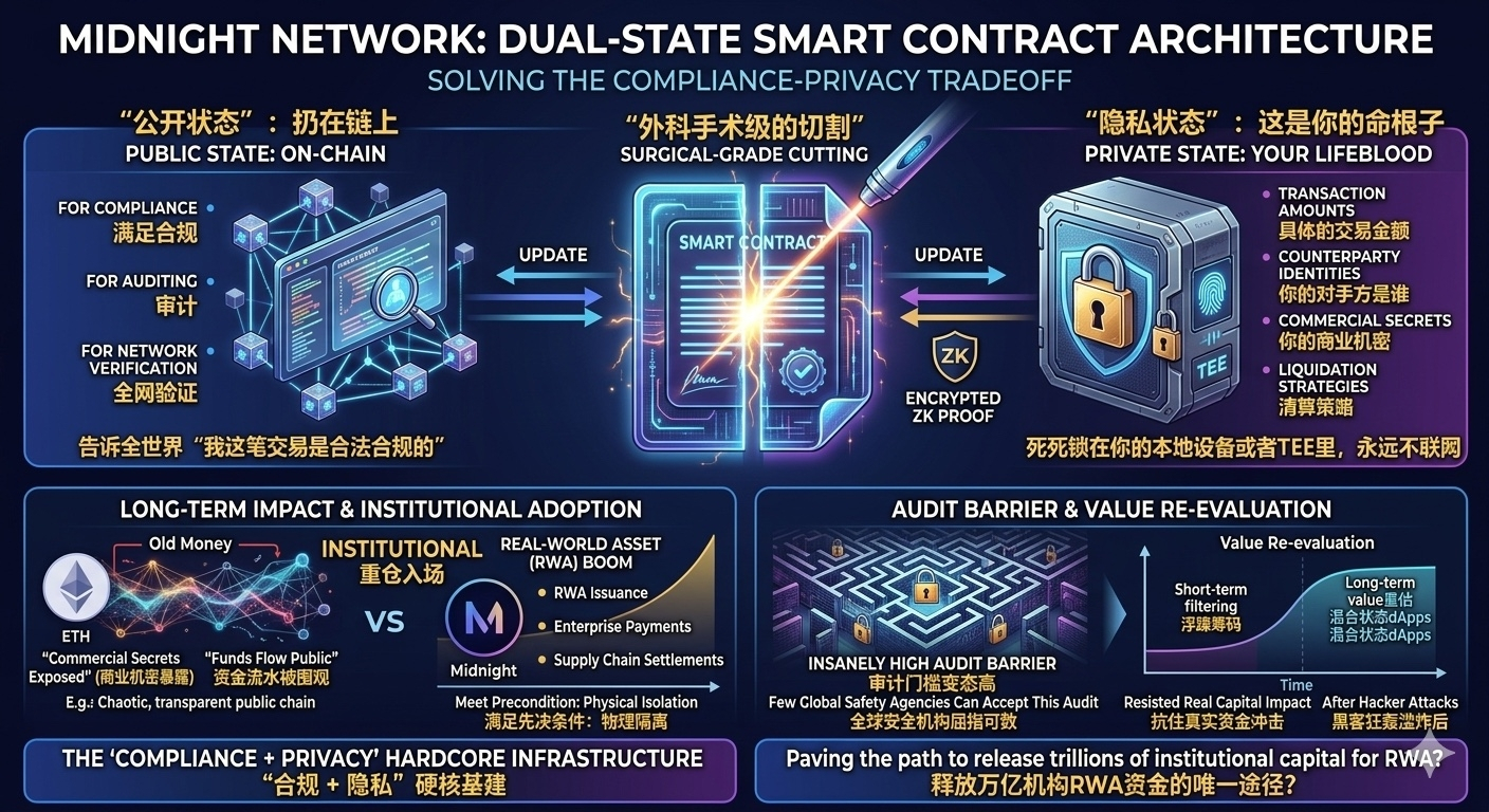 为了做到这一点,Midnight的技术狂魔们对传统的智能合约做了一场“外科手术级的切割”,硬生生把状态剥离成了两半: