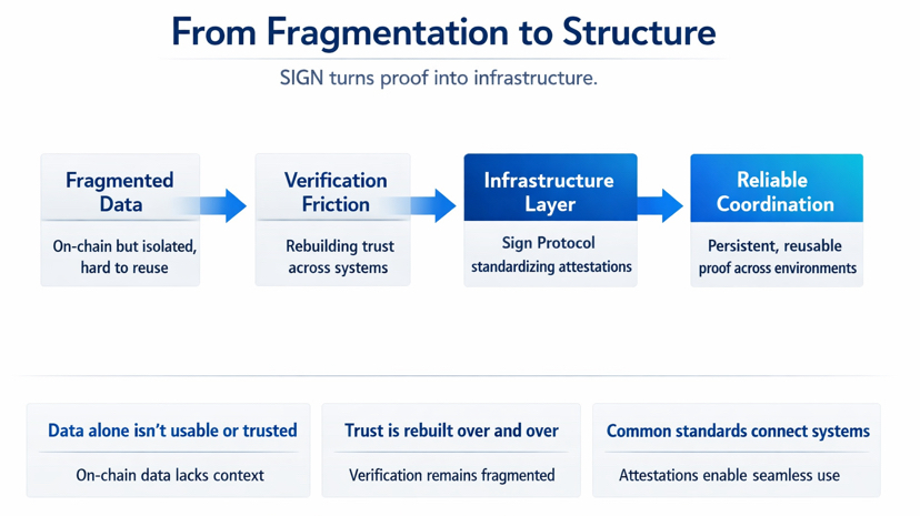 Data can exist everywhere and still be fragmented. Hard to verify across contexts. Hard to reuse without rebuilding logic. Hard to trust once it moves outside the environment it was created in. That’s where things get messy, and that’s where most systems quietly lose efficiency.