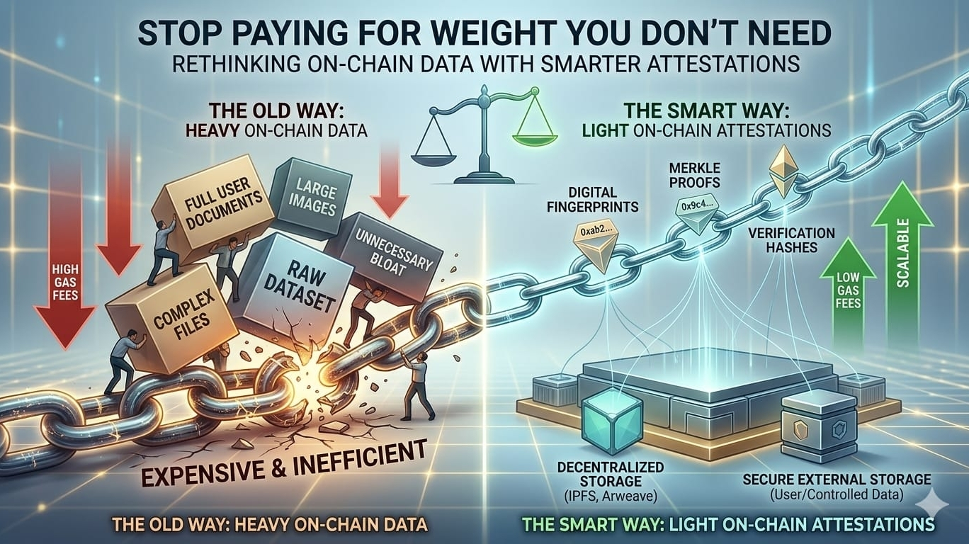 I’ve spent enough time trying to push data onto the blockchain to realize something most people don’t like admitting out loud — just because you can store something on-chain doesn’t mean you should. At first, it feels powerful. Everything is permanent, everything is verifiable, everything is “pure.” But then reality kicks in. Gas fees climb, transactions get heavier, and suddenly you’re paying a premium just to prove something that didn’t need to live there in full detail in the first place. That’s the point where the whole idea starts to feel less like innovation and more like inefficiency. It’s not that blockchain is broken, it’s that we keep misusing it by treating it like a storage system instead of what it actually is — a verification layer.