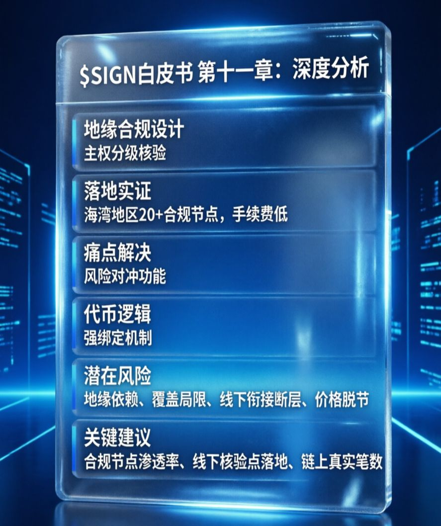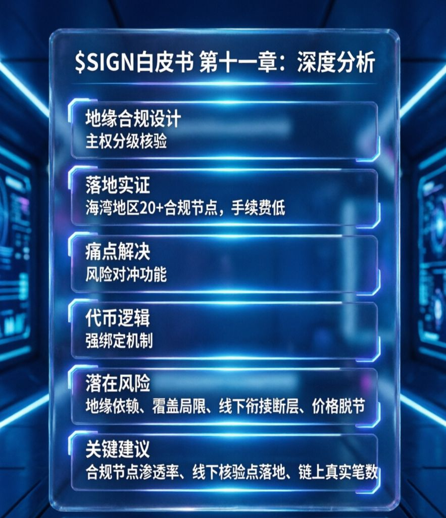 最后说句我实打实的看法,SIGN绝对不是空气项目,白皮书第十一章的设计是真的扎进中东跨境贸易的痛点里,也有真实的落地场景,SIGN的价值也不是炒出来的虚价。但它绝不是闭眼入的标的,后续我根本不看价格波动,只盯三个硬数据:合规节点覆盖数量、链上真实交易笔数、线下核验点有没有落地。只有这些东西实打实往前走,SIGN才算真正扎进中东地缘基建里,不然再好的设计,也只是停留在白皮书里的空想。#Sign地缘政治基建
