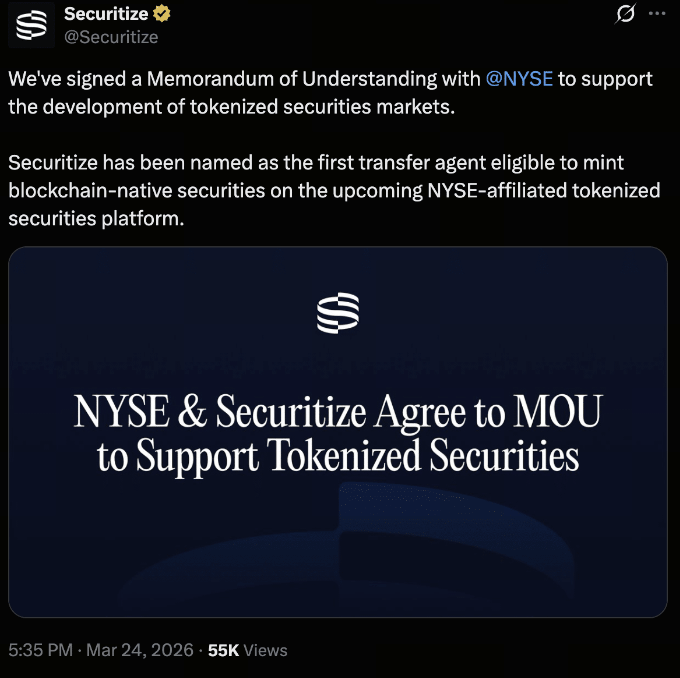 正当市场还在消化这一信息的深远影响时,3 月 24 日,纽交所(NYSE)集团总裁林恩·马丁(Lynn Martin)宣布与代币化平台 Securitize 签署战略合作备忘录。与纳斯达克的温和改良不同,纽交所选择了一条近乎推倒重来的道路:通过数字转让代理,在区块链上铸造原生证券。