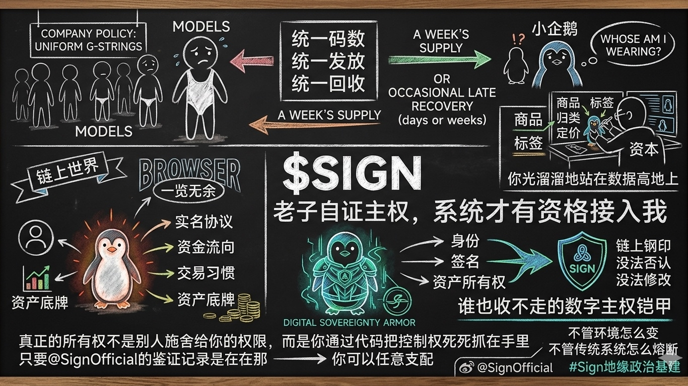 很多人不理解$SIGN ,是因为他们还习惯于向系统请求许可。但Sign的是:老子自证主权,系统才有资格接入我。它要把你的身份、你的签名、你的资产所有权,变成一段任何人都没法否认、没法修改的链上钢印。而Sign就是那套谁也收不走的数字主权铠甲。它让小企鹅明白,真正的所有权不是别人施舍给你的权限,而是你通过代码把控制权死死抓在手里。不管环境怎么变,不管传统系统怎么熔断只要@SignOfficial 的鉴证记录在那,你可以任意支配。#Sign地缘政治基建
