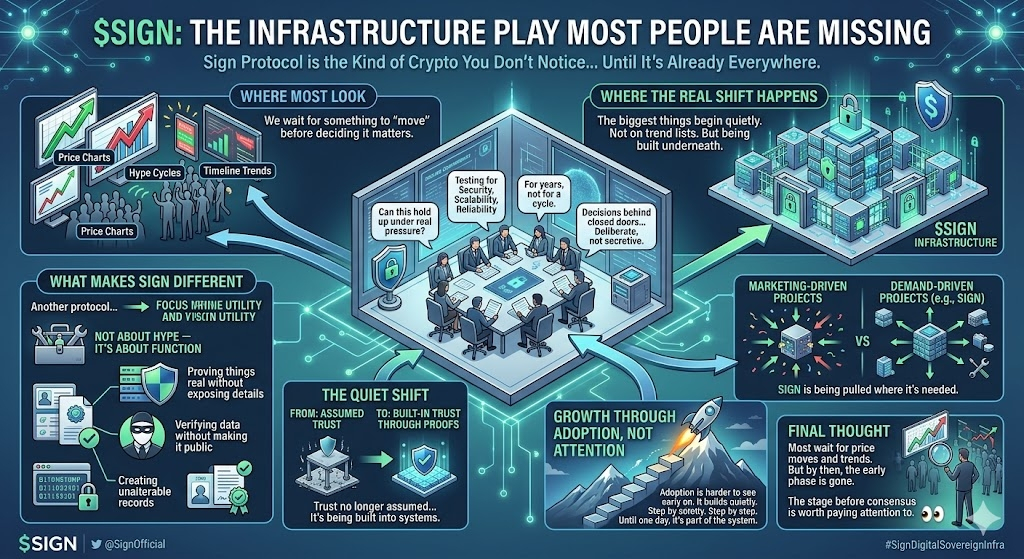 Sign protocol is the Kind of Crypto You Don’t Notice. Until It’s Already Everywhere.In crypto, most of us are trained to look in one place.Charts.Price.Hype.We refresh, we compare, we wait for something to “move” before we decide it matters.But over time, I’ve started to realize something a bit uncomfortable…The biggest things in this space don’t start where we’re looking.They don’t begin on timelines or trend lists.They begin quietly, somewhere else entirely.And by the time they show up in front of us, they’re already in motion.That’s kind of how I’ve started seeing $SIGN .