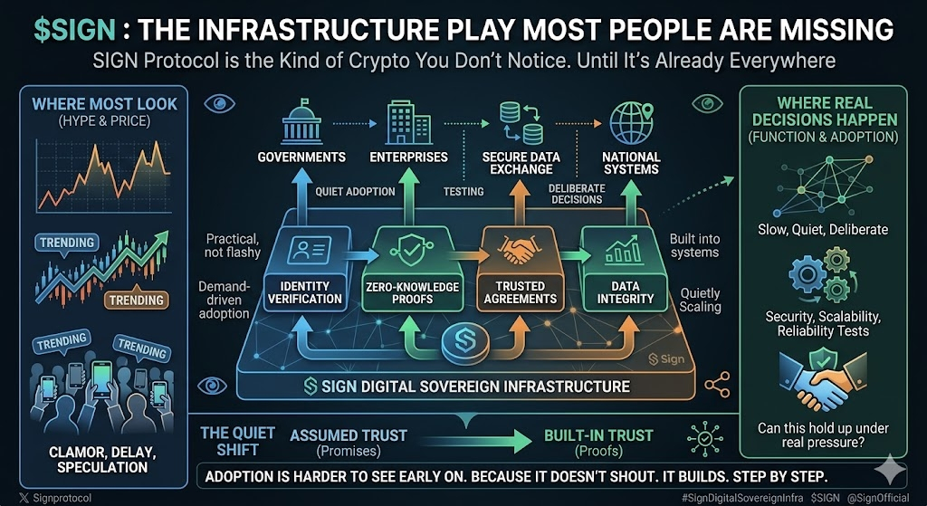 But very little of that actually moves with you in a meaningful way.If trust is engineered, identity becomes more than that. It becomes something you carry.A way to prove something is real without giving everything away behind it.That alone changes how systems can interact.Even agreements start to feel different under this lens. Instead of being static, written once and left as-is, they can become something you can check over time. Not just “trust this was done,” but “verify that it still holds.”None of this is loud.And that’s probably why it’s easy to miss.We’re used to things that matter showing up with noise. Big announcements, big reactions, constant discussion. That’s how attention works here.But infrastructure doesn’t really follow that pattern.It shows up quietly. Solves something specific. Then slowly starts appearing in more places. Not all at once, not in a way that feels obvious just consistently enough that you begin to notice it.That’s more or less how I started looking at $SIGN .At first, it didn’t stand out. It just felt like another protocol doing something around verification. Nothing new on the surface.But it kept coming up.Different contexts. Different conversations. No hype around it, just presence.The more I read, the more it felt like SIGN isn’t trying to be exciting.It’s trying to be useful.And those are very different things.At its core, it deals with identity, verification, and proof.Not in a flashy way.In a practical way.Things like Proving something is real without exposing everything behind itVerifying data without making it publicCreating records that can’t be altered later.