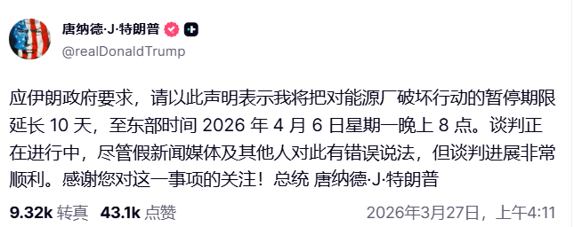 就在市场最恐慌的时候,那个男人又出手了。3月23日,特朗普在Truth Social上宣布,美国与伊朗进行了“富有成效”的对话,并决定“推迟5天”打击伊朗能源设施。
