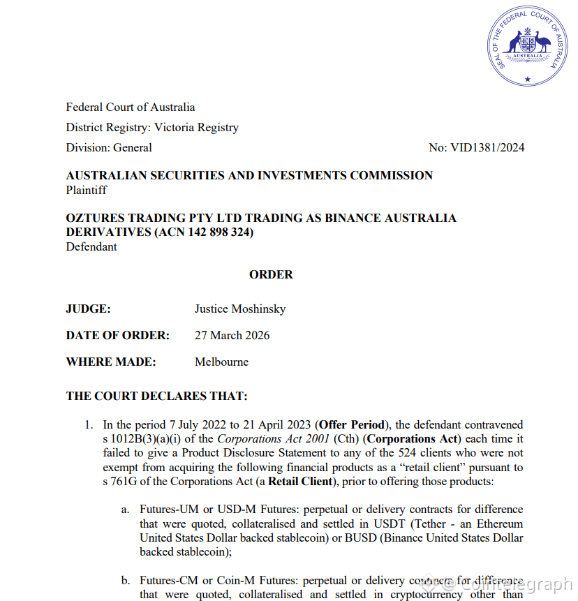 Court order against Binance Australia Derivatives. Source: The Federal Court of Australia