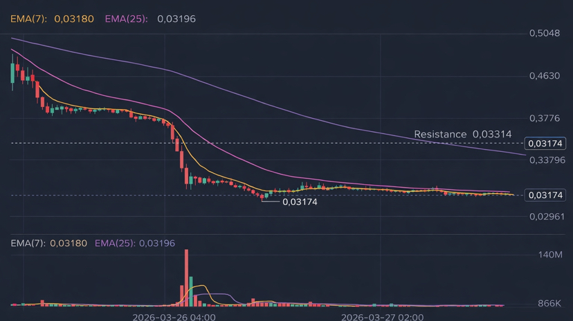 · Цена ниже всех EMA: 7 - 0.03180, 25 - 0.03196, 99 - 0.03548.
