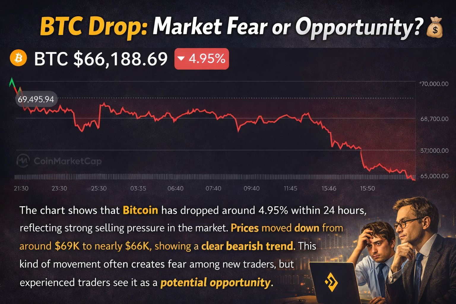 The chart shows that Bitcoin$BTC has dropped around 4.95% within 24 hours, reflecting strong selling pressure in the market. Prices moved down from around $69K to nearly $66K, showing a clear bearish trend. This kind of movement often creates fear among new traders, but experienced traders see it as a potential opportunity. Market corrections are normal in crypto and can happen anytime due to volatility. Smart traders wait patiently, analyze the trend, and make decisions based on strategy—not emotions..$BTC