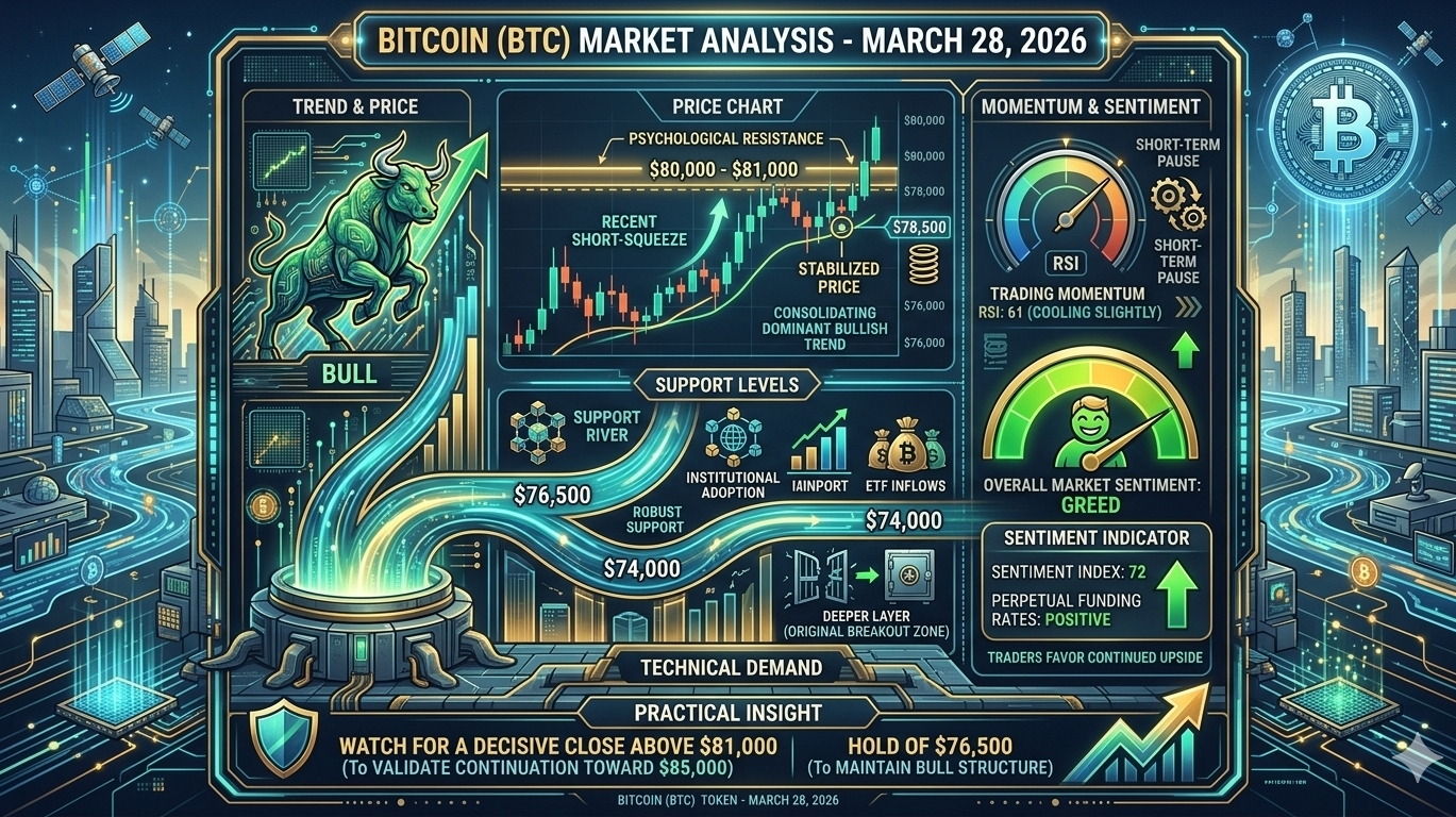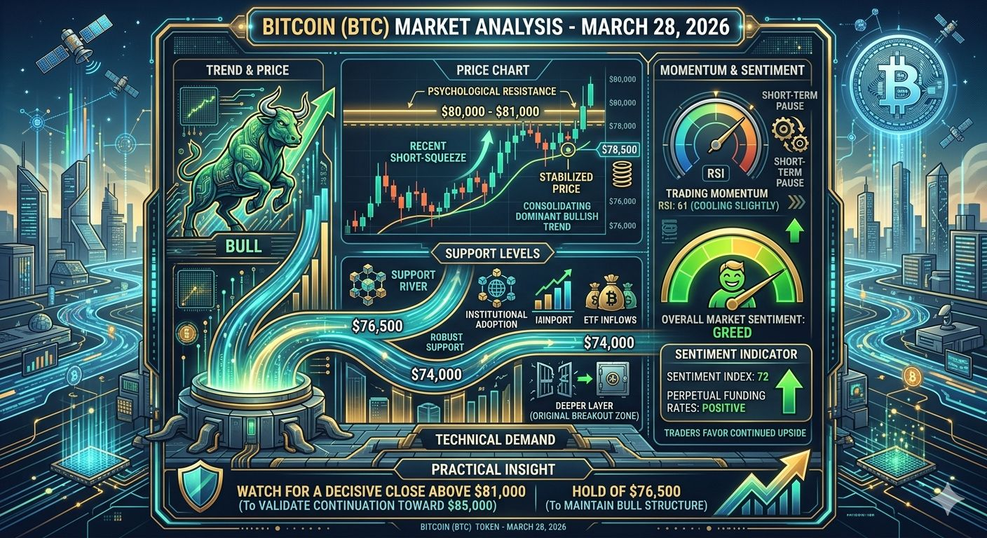 As of today, March 28, 2026, Bitcoin $BTC is consolidating a dominant bullish trend, trading just below its recently tested $80,000–$81,000 psychological resistance area. After a major short-squeeze, the price has stabilized around $78,500. Strong technical and fundamental demand (institutional adoption and ETF inflows) are providing robust support at $76,500, with a deeper layer around $74,000 (the original breakout zone). Trading momentum remains strong but is cooling slightly, indicated by a neutral-to-high RSI (61) on daily charts, suggesting a short-term pause. However, the overall market sentiment is overwhelmingly one of "Greed" (Index: 72), and the perpetual funding rates remain positive, indicating traders are favoring continued upside over a deep reversal. Practical insight: Watch for a decisive close above $81,000 to validate a continuation toward $85,000, or a hold of $76,500 to maintain the bull structure.