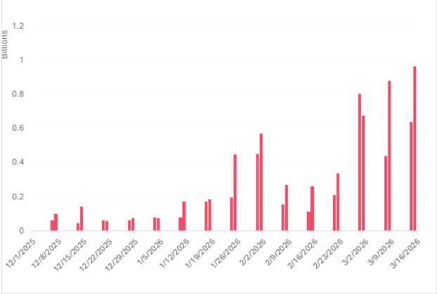 Объёмы торгов HIP-3 по выходным резко выросли. С января 2026 года почти в 9 раз, отмечают в отчёте.